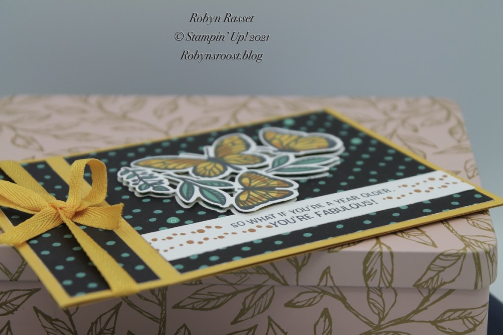 I started off with the butterflies adhered flat on the card but wasn’t happy with that, so stamped and die cut another image and layered it over top with dimensionals. The awesome thing about the Floating & Fluttering stamp set is how fast it is to pop out this image. These butterflies and leaves are all on one stamp and all have stamps to fill them in! One done stamping there are 2 TWO! dies so that 2 of the images can be cut out at one time.