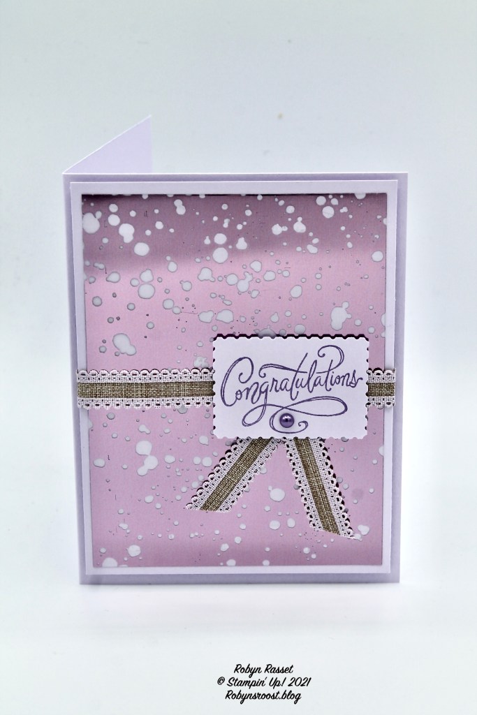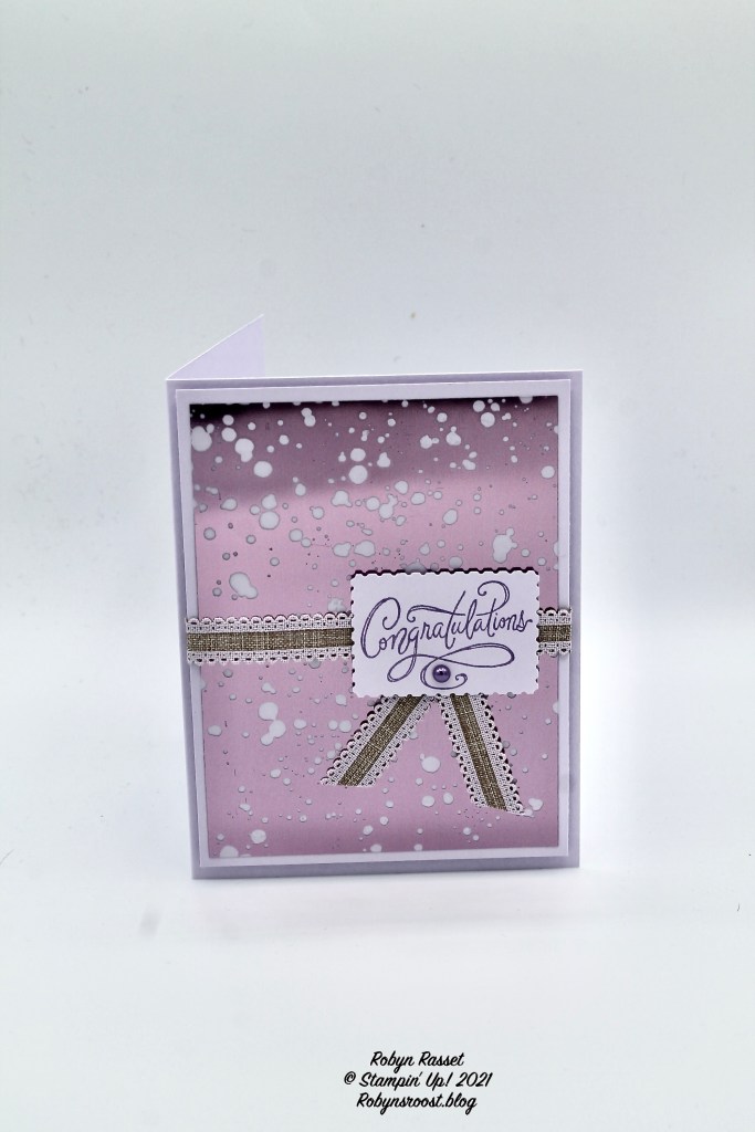 The Hydrangea Hill Mercury Glass makes a very elegant background for this wedding card. It comes in a pack of 4 with 1 sheet each of 2 designs in 2 colors, Highland Heather and Rococo Rose.