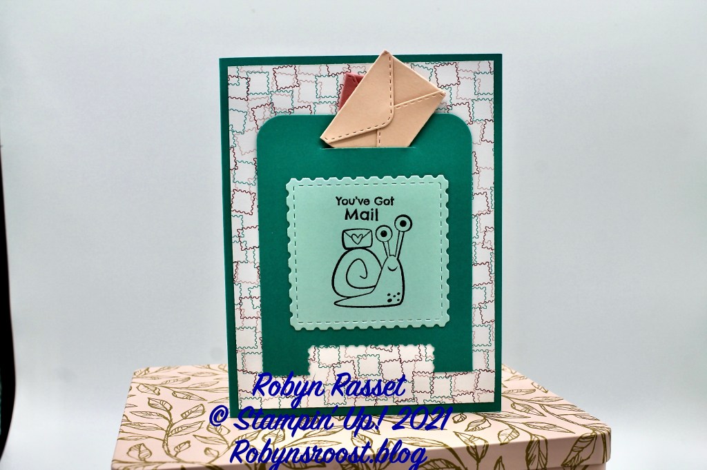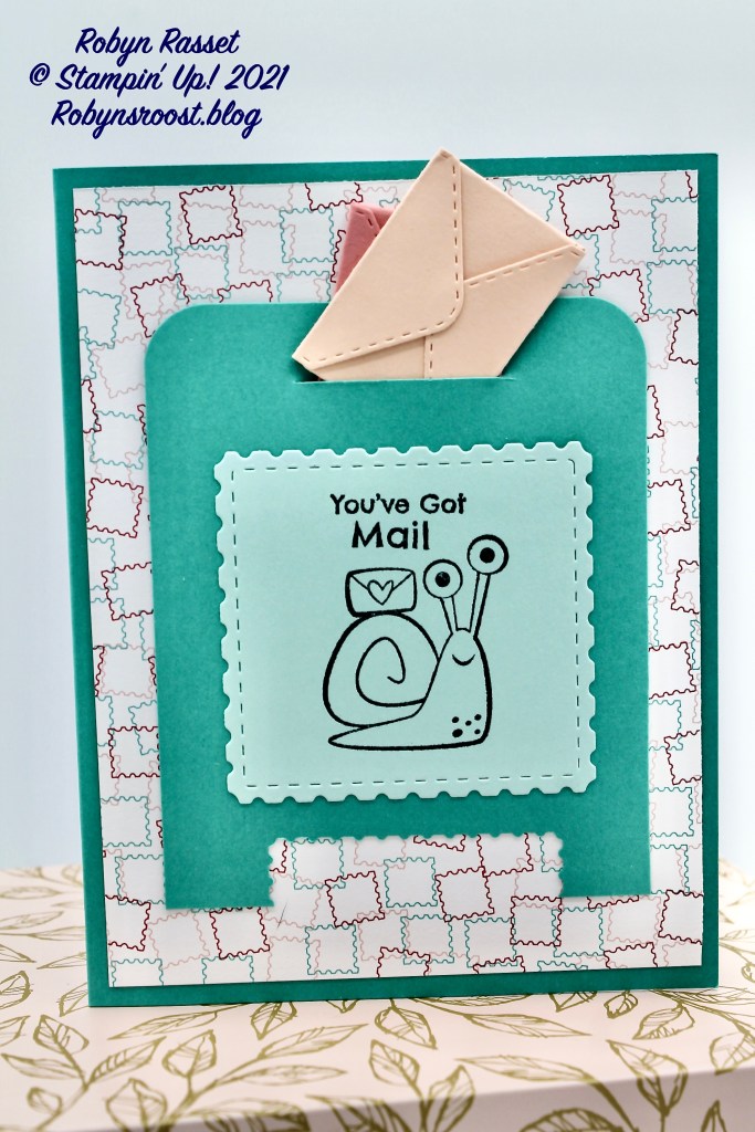 The little mini envelopes are cut with a die in the Snail Die set which coordinates with the Snailed It stamp set. The only stamping on this card is the cute little snail done with Tuxedo Black ink. He is placed on another die, cut from the Snail Die set.