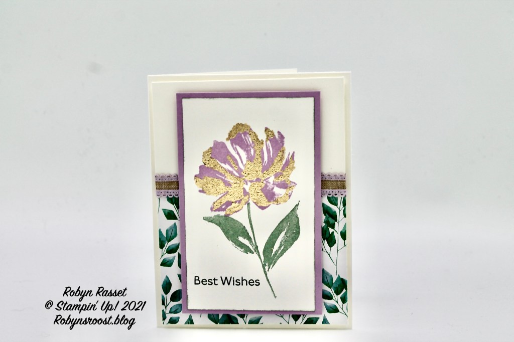 The inks used for the flower and greeting are all from the new in-color selection. Fresh Freesia, Soft Succulent and Evening Evergreen. The matte layer is a 3″ x 4 3/4″ piece of the Fresh Freesia card stock. The ribbon is the retiring Purple Posy 2019-2021 in-color ribbon. The Forever Greenery Designer Paper is one of my all time favorites, but is retiring at the end of the month.