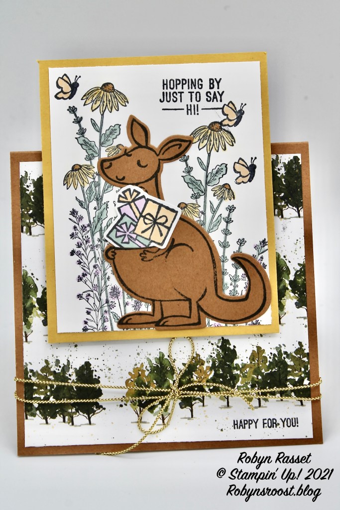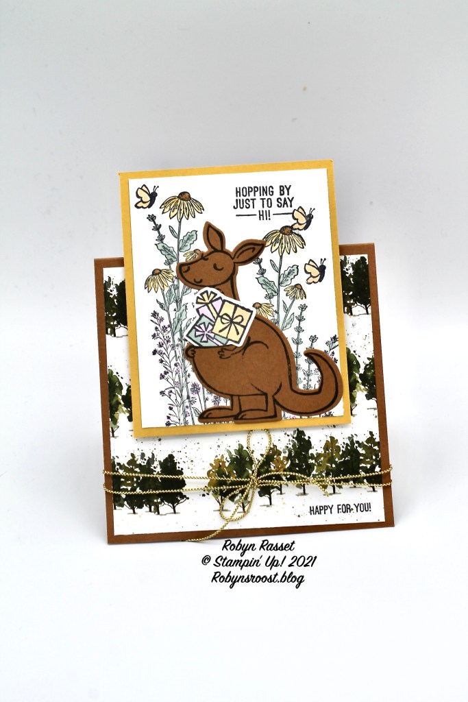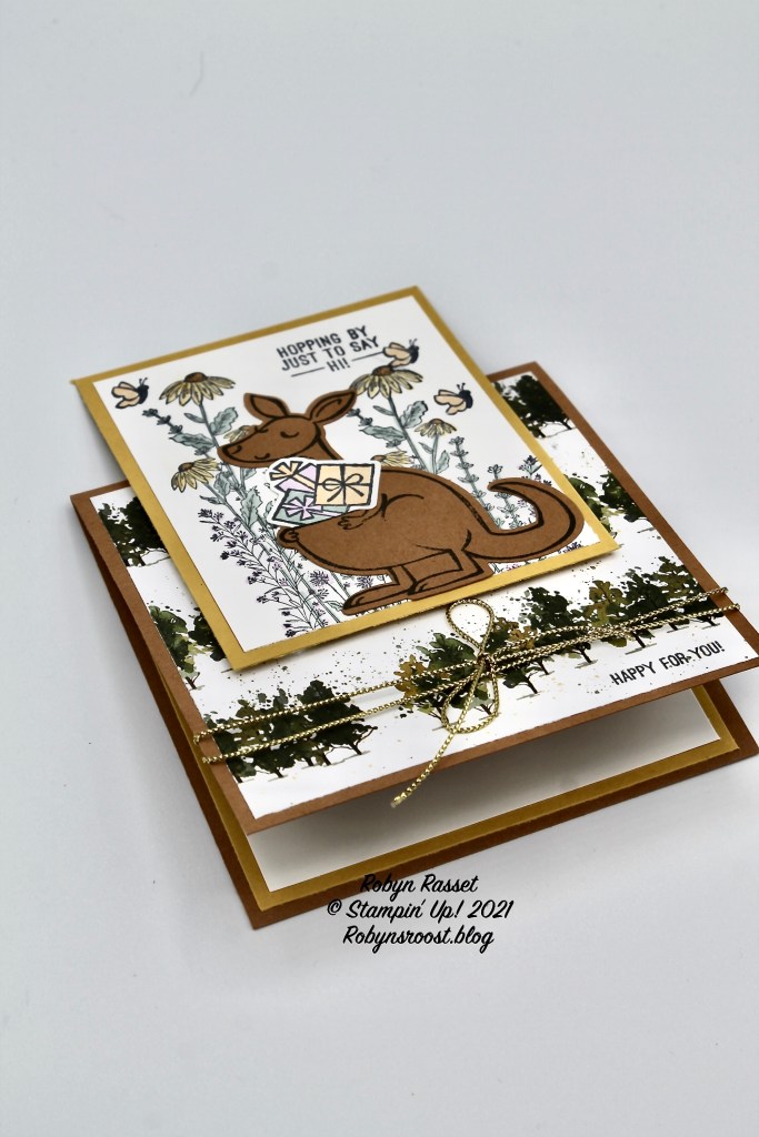 This Fun Fold works great for having a Kangaroo hop on my with a happy greeting. I’ve combined two stamp sets to create this card. The Daisy Garden and the Kangaroo & Company. I’ve pulled in some new products that will be available starting May 4 in the 2021-2022 Stampin’ Up! Annual Catalog. The metallic twine which comes in a 2 pack with both gold and silver and the tree paper which is part of the Beauty of Earth Designer Series Paper pack.