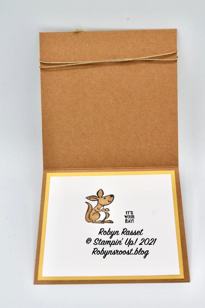 The inside starts with a 4″ square of Bumblebee card stock, followed by a 3 3/4″ square of Basic White. The little Roo is colored with a Cinnamon Cider Stampin’ Blend.