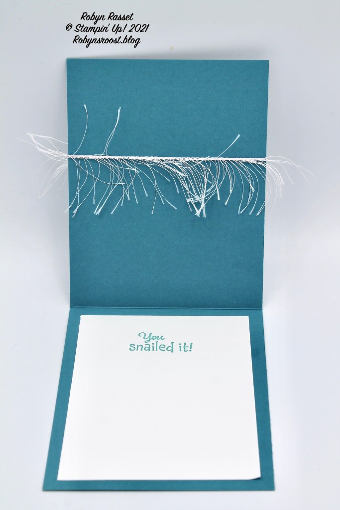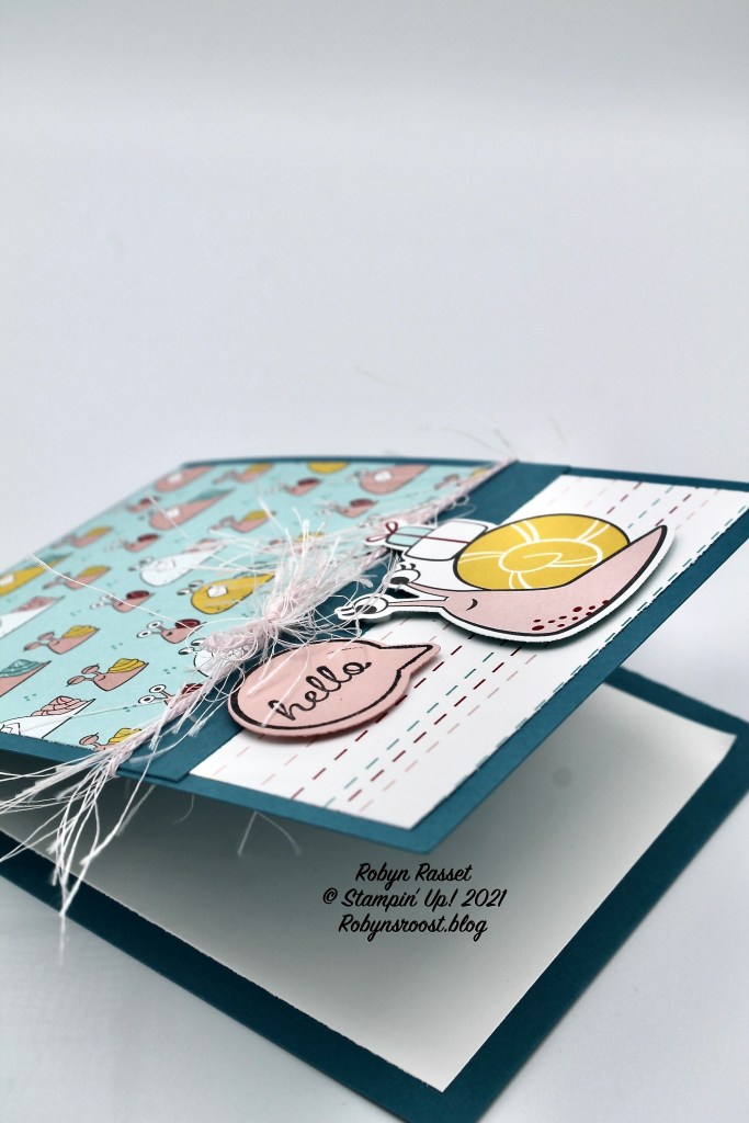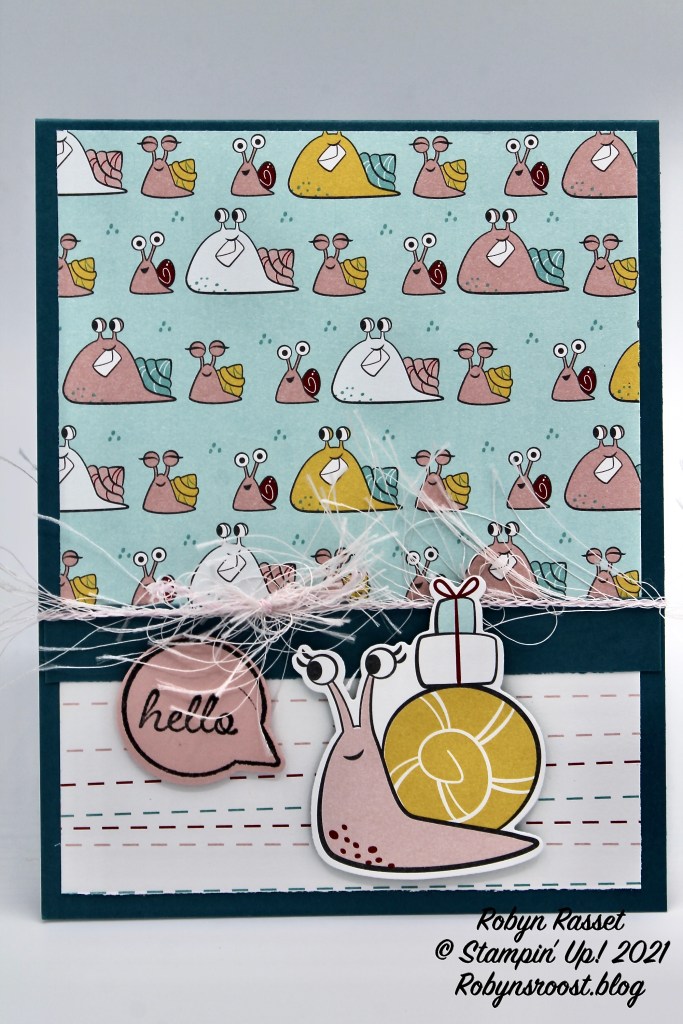 This card uses the Snailed It stamp set, matching Snail Dies, and coordinating Snail Mail designer paper, but any coordinating stamps and double sided designer paper would work great too.