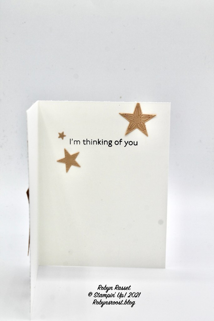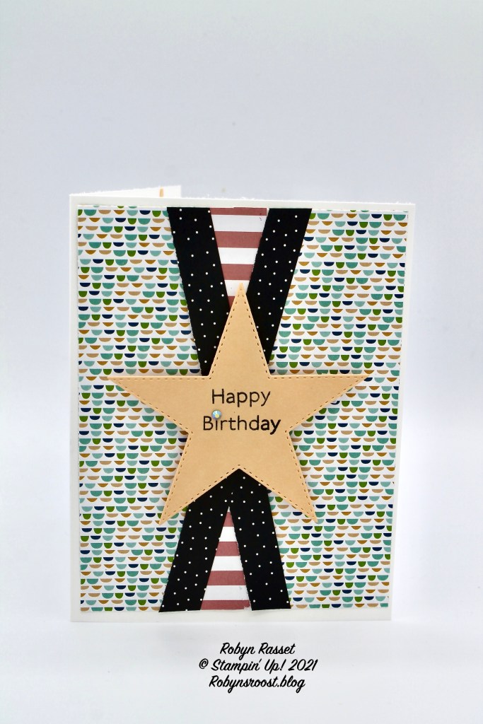 So for my retry, I used the same Pattern Play paper, which is a Hostess Reward in the new 2021-2022 Annual Stampin’ Up! Catalog. I pulled out the Stitched Stars Dies and then had to search my stamp library to find a happy birthday greeting to fit inside of the star. I finally found one in the Art Gallery set but did end up masking off the words so that I could put them on two lines instead of one. I added one of the small gems from the In-Color Jewels embellishments.