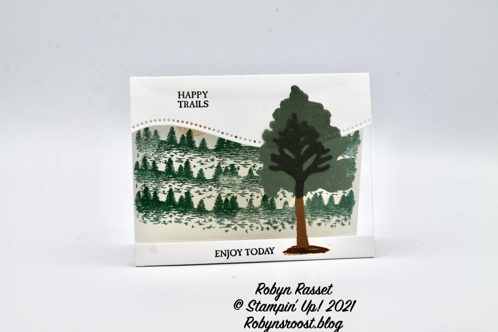 This tent card didn’t turn out quite like I’d hoped but it does give you a good idea of what the Shimmer In Color Vellum looks like. I’ve combined the Mountain Air background trees with the greetings from the Campology stamp set with the new Beauty of Friendship stamps. The Beautiful Trees Dies were used to cut out the tree in the foreground ad the Curvy Dies were used to cut the dotted curve on the card front.