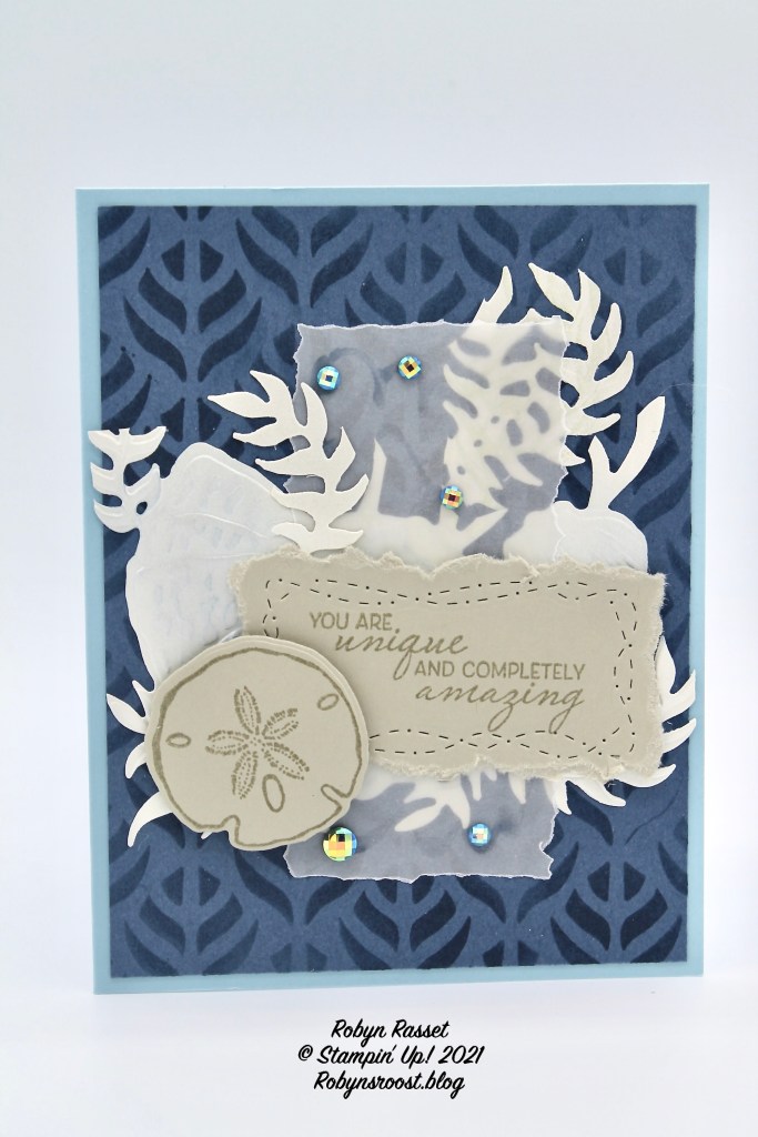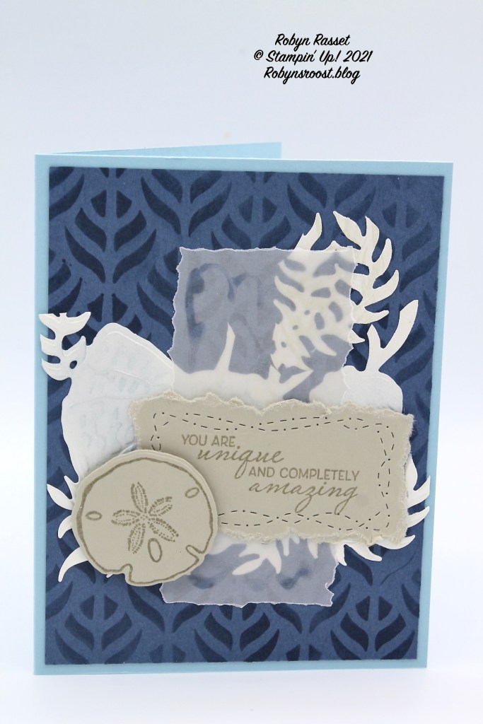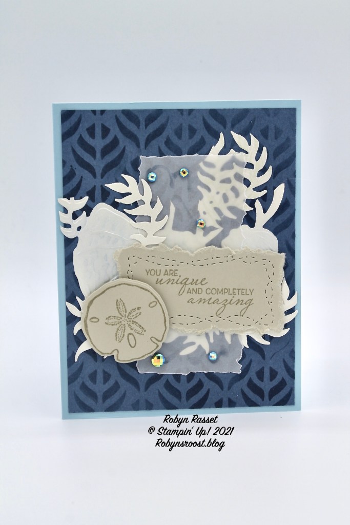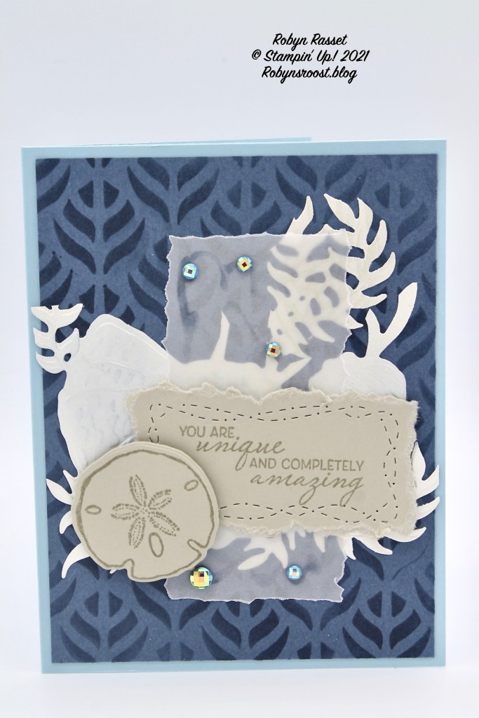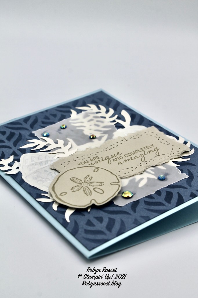 For the final layers, I used Sahara Sand card stock for both the Sand Dollar and the greeting, and Sahara Sand ink. I’ve added a Stitched With Whimsy die cut around the greeting and then tore around the edges. I did add another sprig of the seaweed and some of the Blue Gems to hid my glue marks. The pretty Sand Dollar was the easy part, just a quick turn of the handle on the Cut and Emboss Machine and a die from the Seashell Dies set.