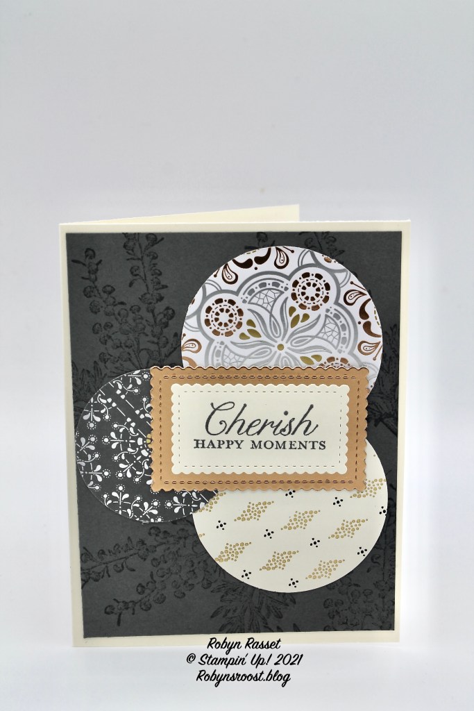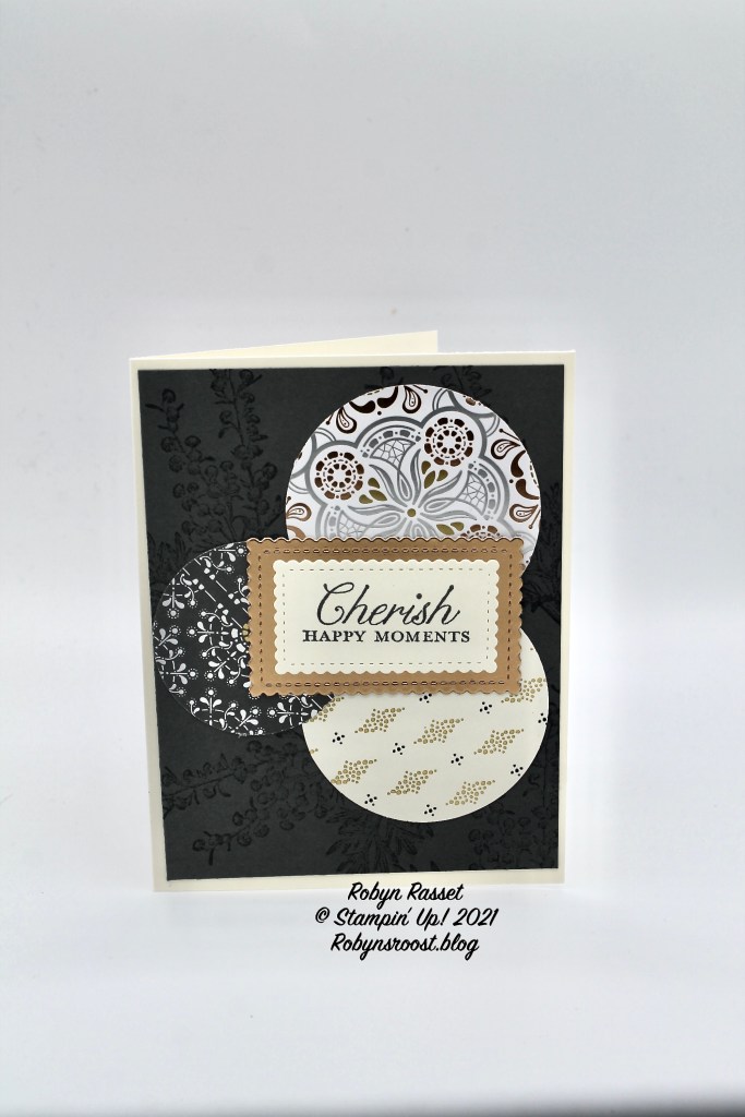 This card uses a greeting from a different stamp set because, alas, I don’t have the Elegantly Said stamp set yet, but I do have the GORGEOUS Simply Elegant Specialty Designer Paper.