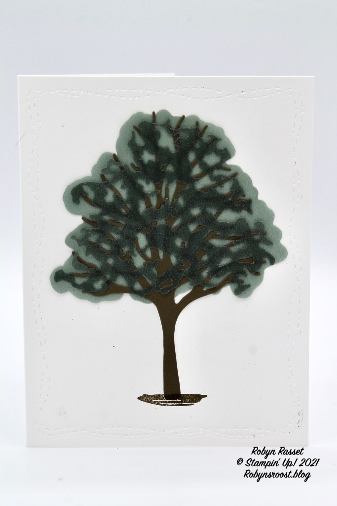 This close up of the tree top show the luscious sparkle of the Shimmer Vellum. I’ve used the Soft Succulent for the larger die cut in the background and the Evening Evergreen for the top leaf die cut, with a Soft Suede tree trunk sandwiched between.