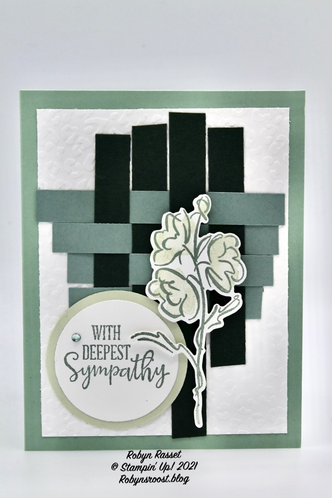 For the month of May, I’m participating in a Connect 10 Challenge with my demonstrator group and my next choices were either a Monochromatic card or a Note Card. I had a pile of these 1/2″ strips laying by my trimmer and decided to weave them into a background. I just cut the ends randomly at various lengths. Because they were Evening Evergreen and Soft Succulent, I decided to do a Green Monochromatic Card, lol, serious thought went into the color choice, right?