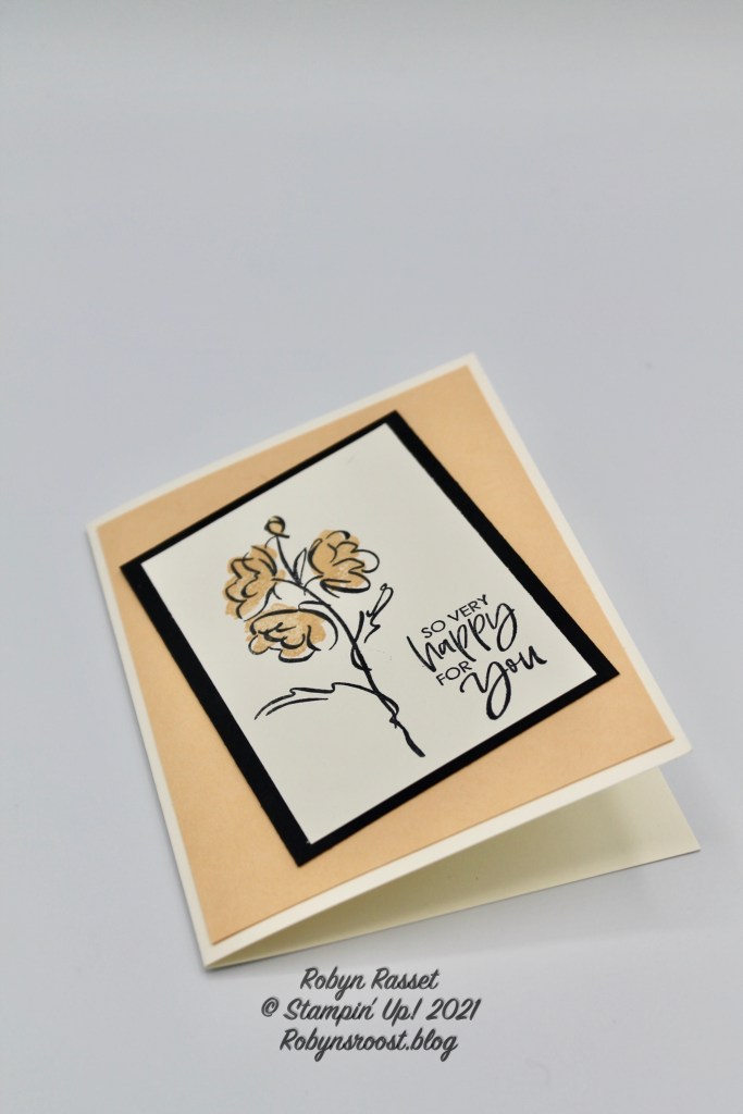 The images are stamped on a piece of Very Vanilla card stock which is 2 3/4″ x 4″ and layered onto a piece of Basic Black which is 3″ x 4 1/4″. Rather than aligning it straight on the card front, I tipped it a bit. I’m not very good at straight, so this another little tip that beginners can use if you have trouble getting things even.
