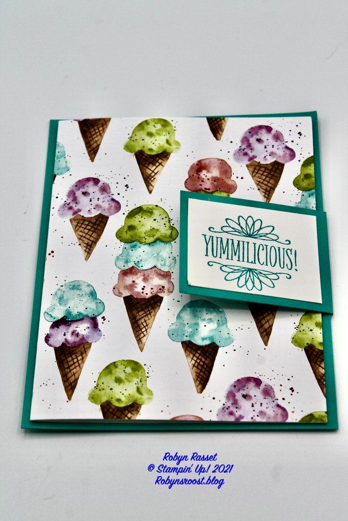 The Yummilicious greeting is from the retired So Sentimental stamp set but the Sweet Ice Cream stamp set has some sweet greetings as well. The Sweet Ice Cream set is in the new Annual Catalog and so will be available for an entire year, yay! The Ice Cream Corner designer paper, on the other hand, is going to be retiring soon. If you like this paper, order it now! The January to June Mini Catalog sales period ends on June 30 but at this point, the paper will no longer be available once the stock runs out, so don’t wait.