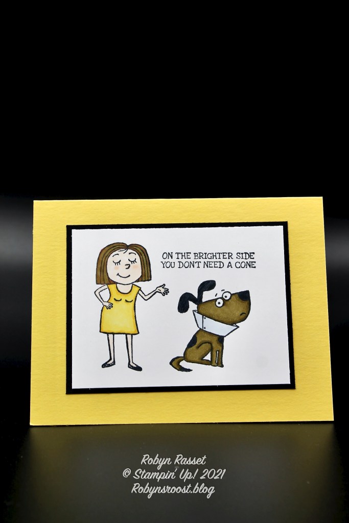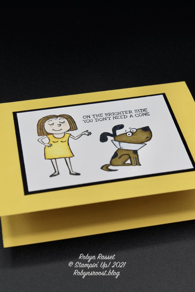 I fell in love with this little dog in his cone when I saw this Bunches of Fun stamp set. It was super easy to make this card. I did the coloring with Stampin’ Blend Markers.