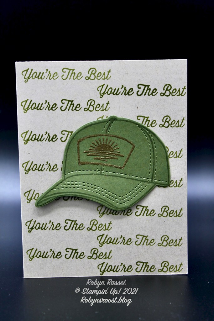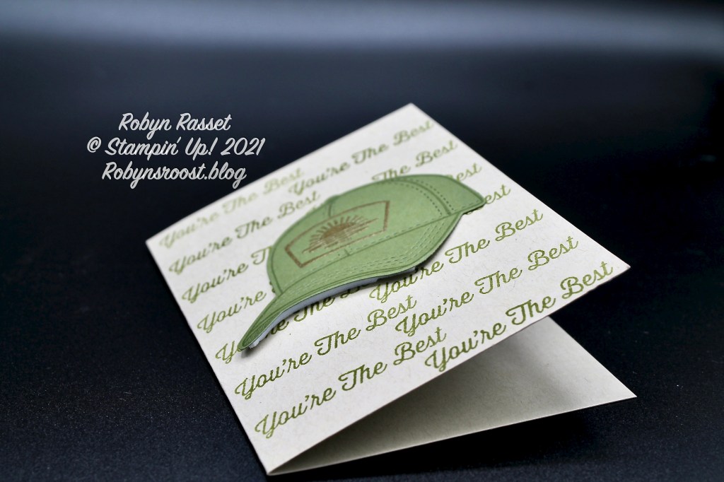Use Mossy Meadow ink to stamp the hat onto Mossy Meadow paper and die cut. Stamp the Crumb Cake card base with the greeting in Mossy Meadow. The Sun Emblem is stamped with Versa Mark and heat embossed with Gold Embossing Powder but if stamping with kids, skip the embossing and stamp with Mossy Meadow ink.