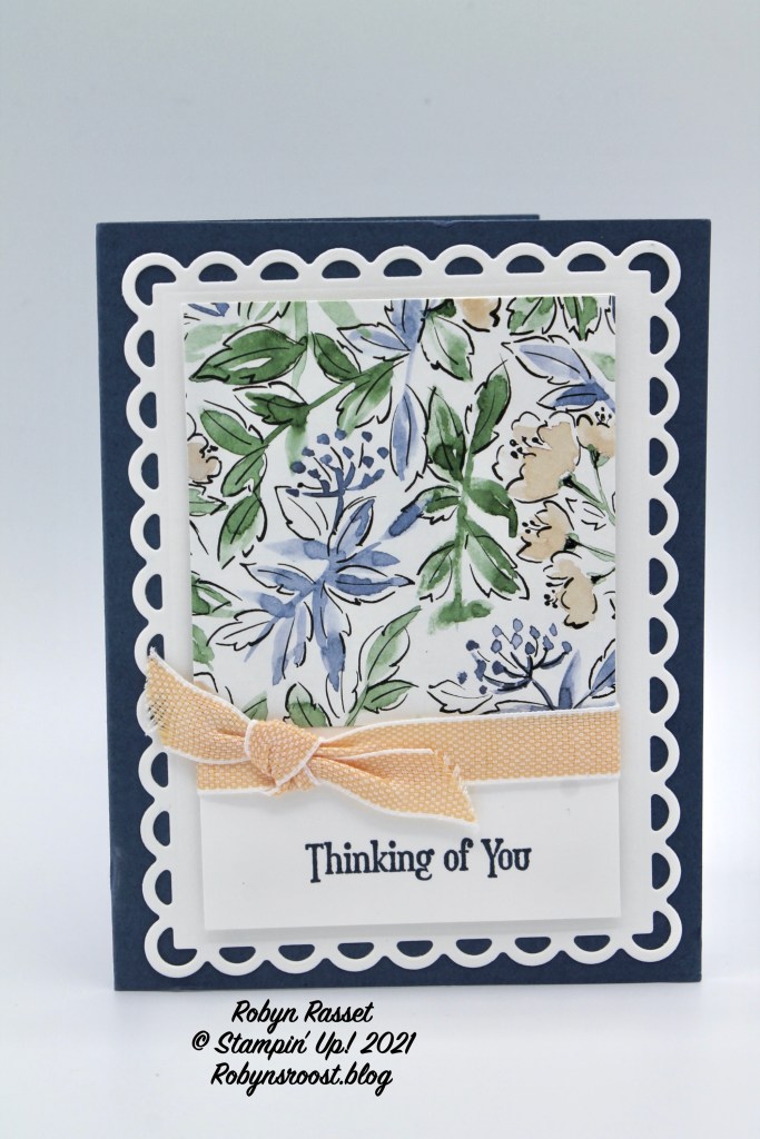 This very easy to create card was made by Susan Burch. It very clean, simple and classical. The base is Misty Moonlight, 5 1/2″ x 8 1/2″ scored at 4 1/4″, topped by a Scalloped Contours Die cut of basic white. Next is a 3″ x 4 1/2″ piece of basic white with a 3″ x 3″ square of Hand Penned Designer Paper adhered to the top. The greeting is from the Quiet Meadow stamp set. A piece of Pale Papaya ribbon is knotted around this layer and it is raised up with dimensionals.