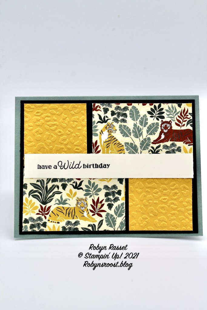 Here I’ve used the Wild Cats designer paper and stamps. The added Basic Black paper is 5 1/4″ x 4″ and the decorative blocks remain the same size but are spaced a bit closer. If you don’t have an embossing machine, the square pieces could be stamped, or even left plain.
