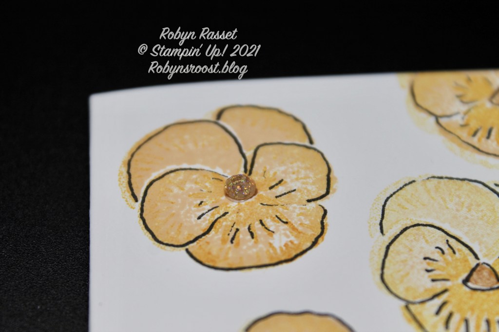 To create the pansies, I did the first stamping full strength, then stamped two more pansies without reinking for all of the layers of each pansy. I think that the ink colors are Pale Papaya, So Saffron and Mango Melody, but I was throwing ink every which way last week when I was creating cards for the DOstamperSTARS online event. This card didn’t make the cut and I didn’t write down the ink colors (I was going to remember, hahahah). The centers are definitely Cinnamon Cider.