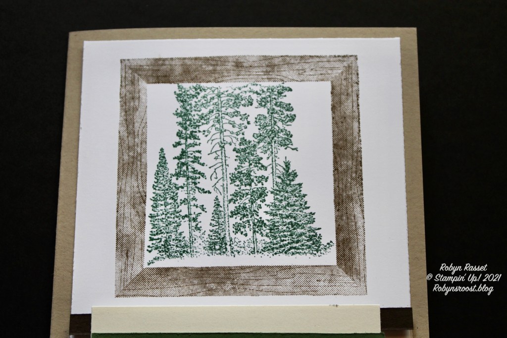 I wanted to add the tent image from the Campology set to a card with the window frame and point blanket. To fit everything onto the card, I decided to make a slimline card. The inspiration again came from the card Concept image below.
