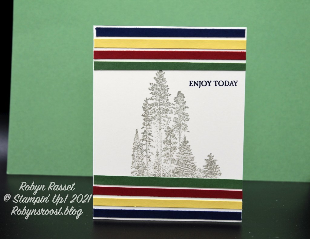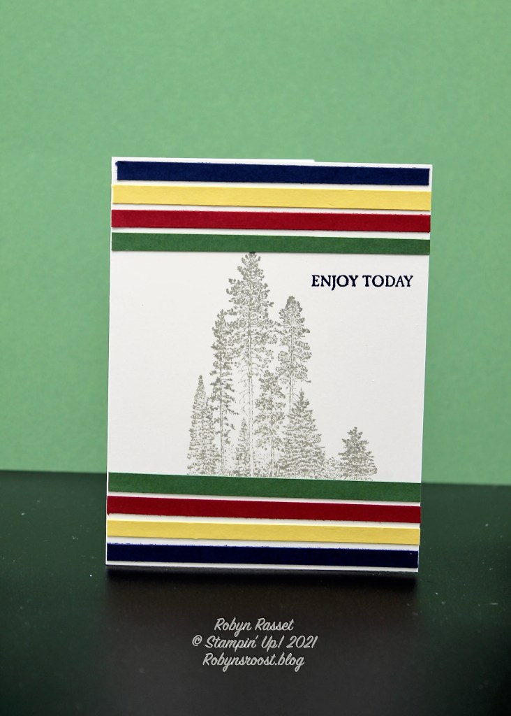 The colored paper strips on the top and bottom are meant to represent a Hudson’s Bay Point Blanket. They are 1/4″ x 4 1/4″ in Garden Green, Real Red, Daffodil Delight and Night of Navy.