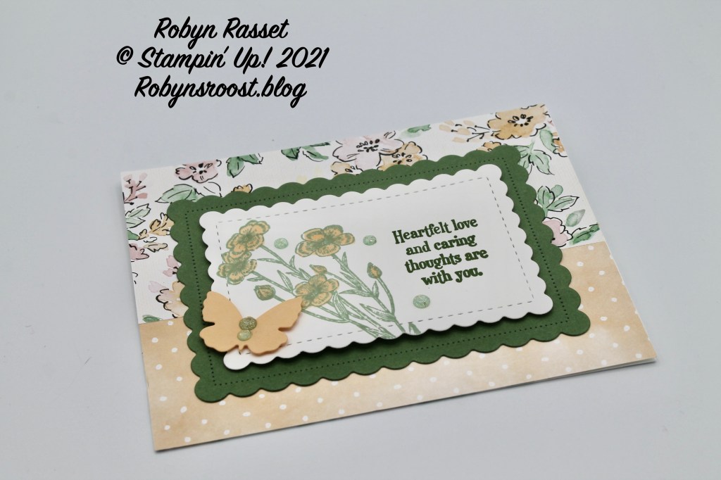 This beautiful, clean and simple card was created by Jan Carlson. It uses the Flowers of Friendship stamp set and the 2021-2023 In Colors-Fresh Freesia and Evening Evergreen. I like how she inked the flowers with Fresh Freesia and the stems with Evening Evergreen. Knowing Jan, I bet she didn’t even mask off the stamps. Jan is the FASTEST stamper I’ve ever known and the absolute best at finding great seats at Stampin’ Up! demonstrator events!