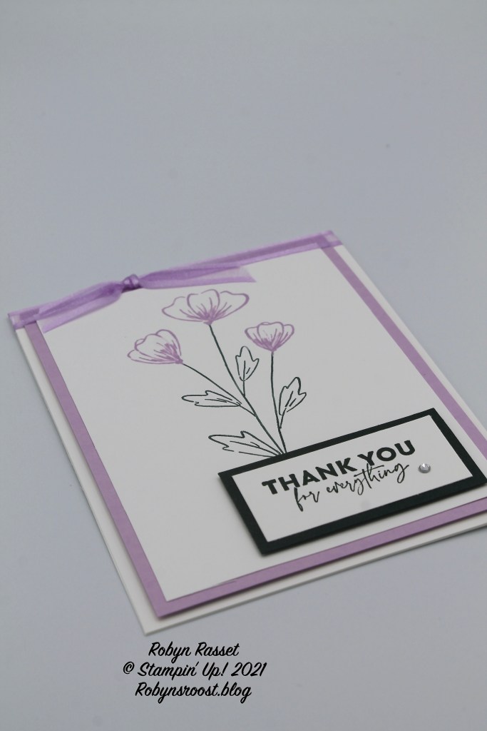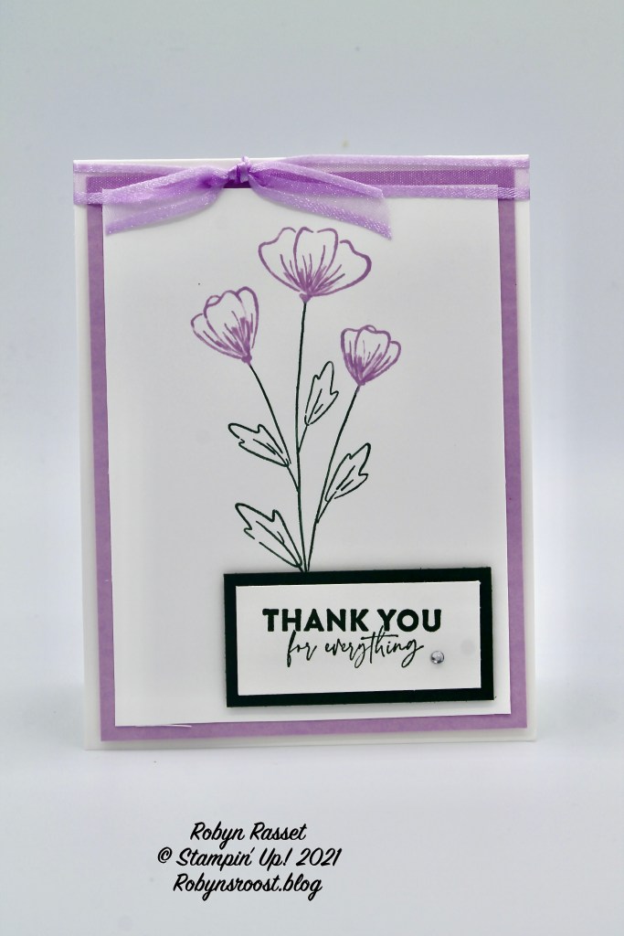 Both the Fresh Freesia layer and the Evening Evergreen greeting layer are popped up with dimensionals. The card is a top fold and the Fresh Freesia Open Weave Ribbon is a nice touch, knotted at the top.