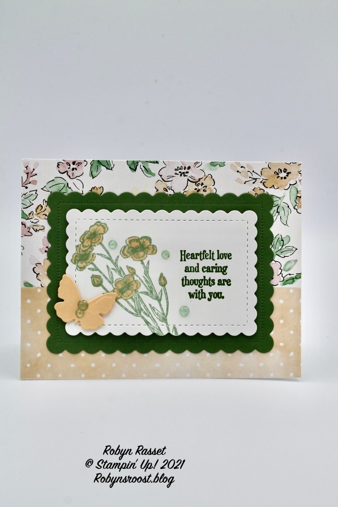 Stephanie’s pretty card uses the Quiet Meadow Bundle. This gorgeous set is one that I overlooked. As well as the butterfly die, the Meadow Die set contains gorgeous stems and flowers as well as labels. Instead of cutting out the stamped images the die cuts coordinate with the stamped images. Stephanie chose the Hand-Penned Designer Paper to place in the background the images and cut it to show both sides. The pretty scalloped edged layers were cut with the Scalloped Contours Dies, one of my favorites! And a few of the Genial Gems are scattered across the card and on the butterfly.