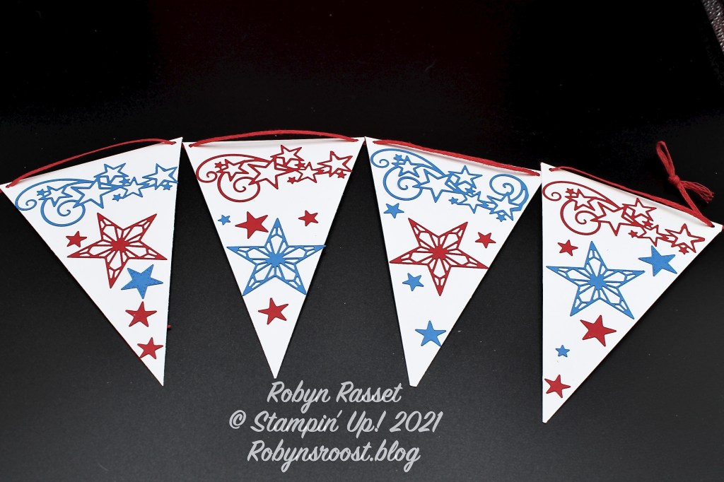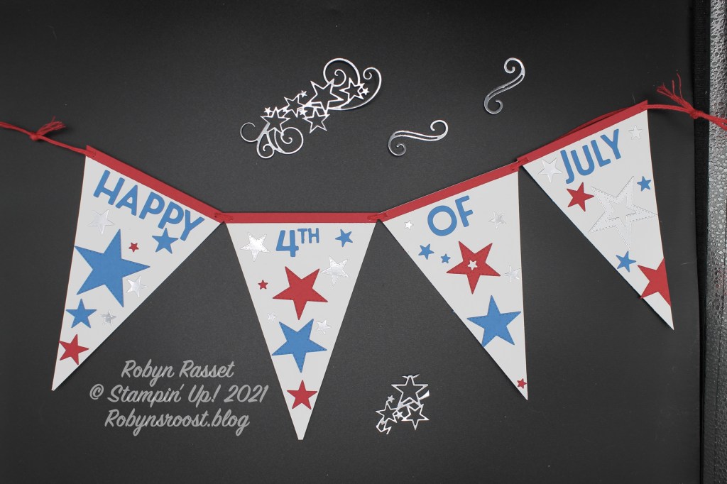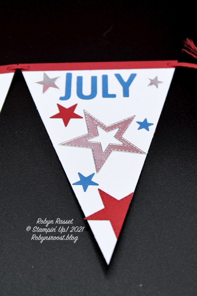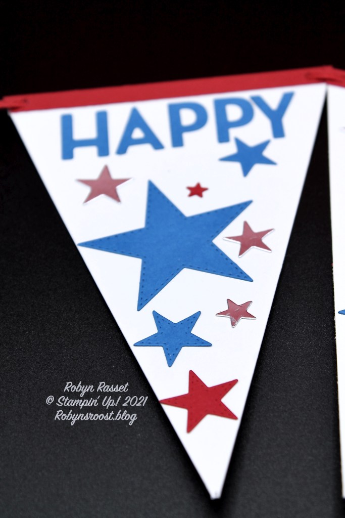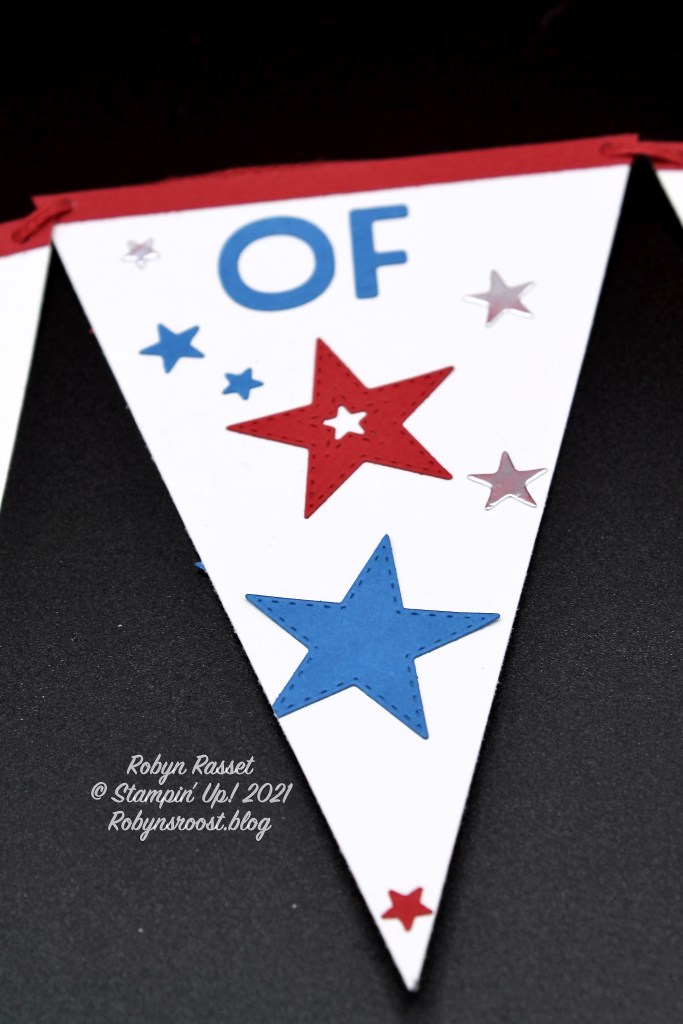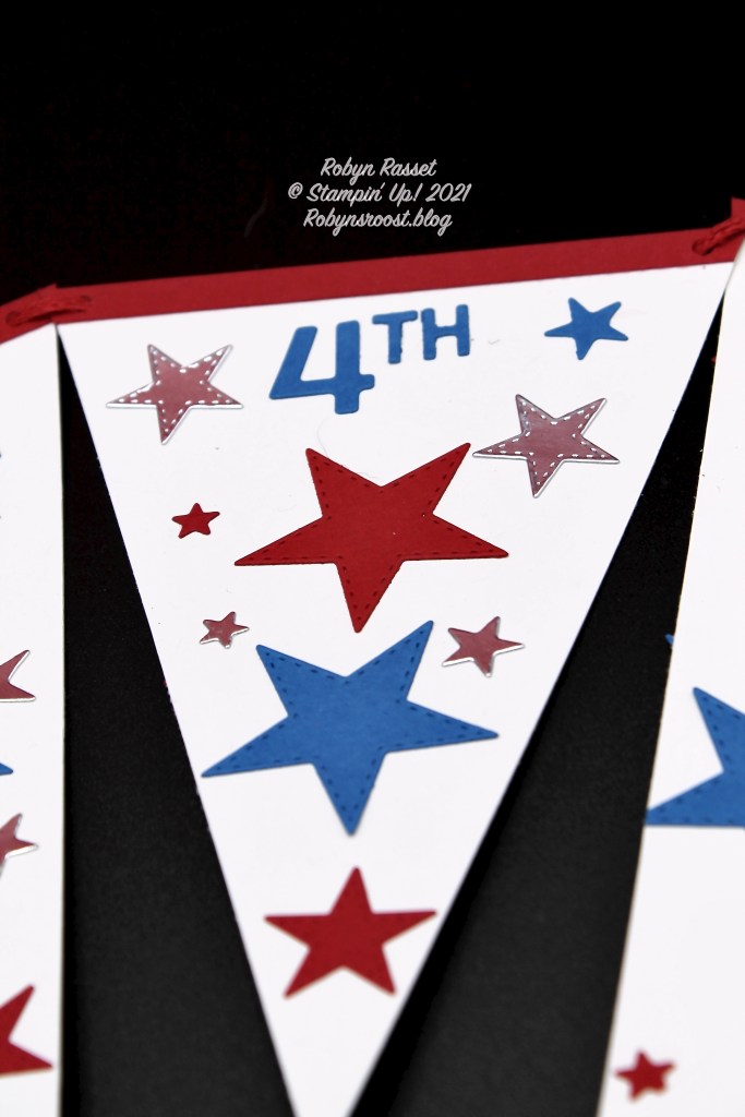 The banner bases start with 6″ x 4″ pieces of Basic White. Measure and mark the center of one short edge (2″) and cut from each top corner to the mark to create the banner base. Cut out an assortment of Silver Foil, Real Red, and Pacific Point Stitched Stars. Cut the words out of Pacific Point card stock with the Playful Alphabet Dies. (Theth” on 4th was cut with the retired Little Numbers die.) The red strip across the top is 1/4″ wide Real Red and was cut to fit after it was adhered.