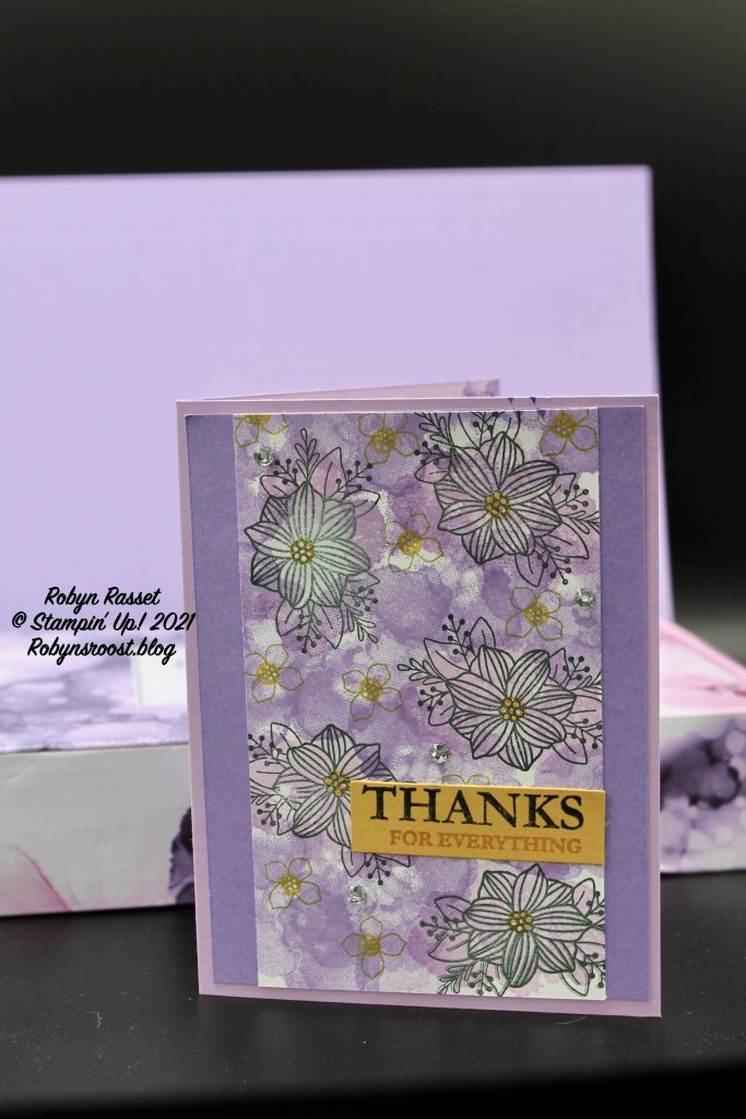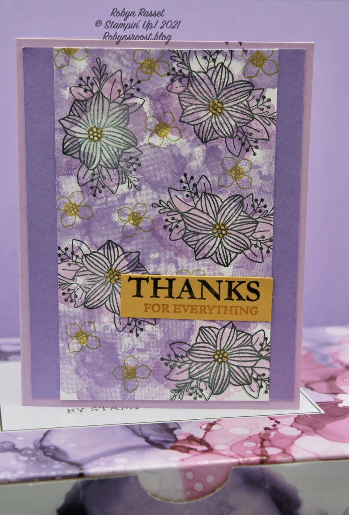 The final card is smaller, a little thank you note. I loved the way the flowers stamped onto the green designer paper added interest. This card is also made following the directions.