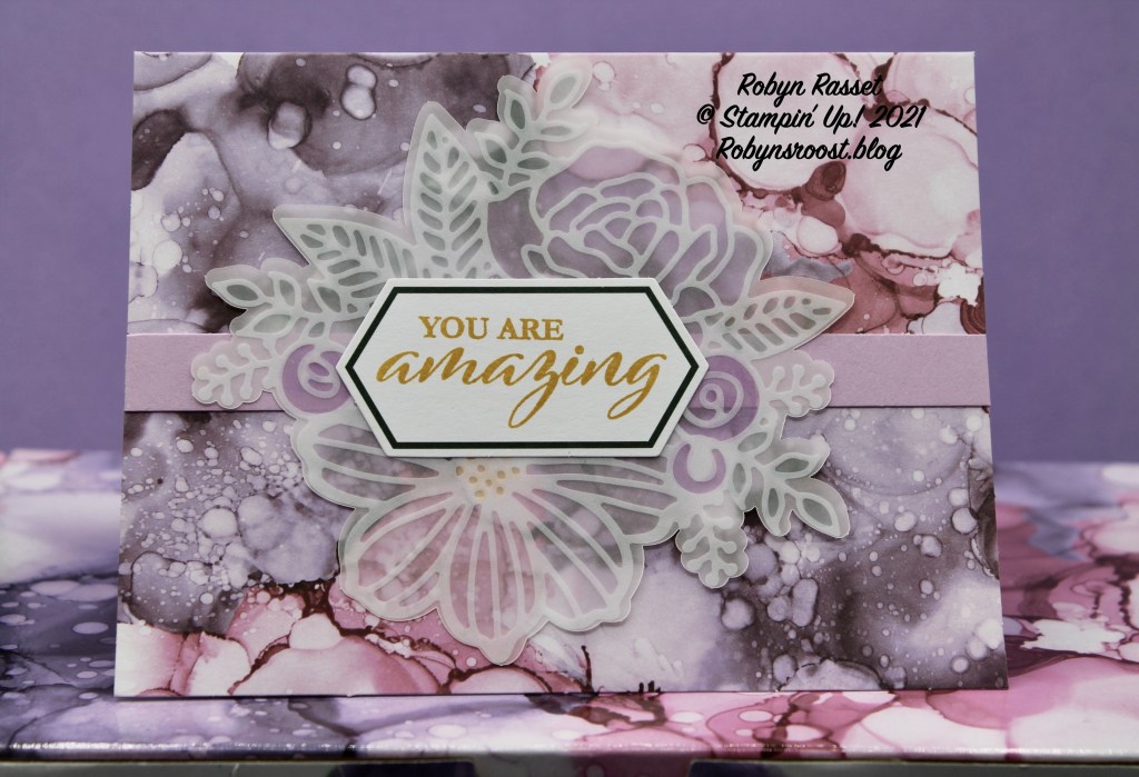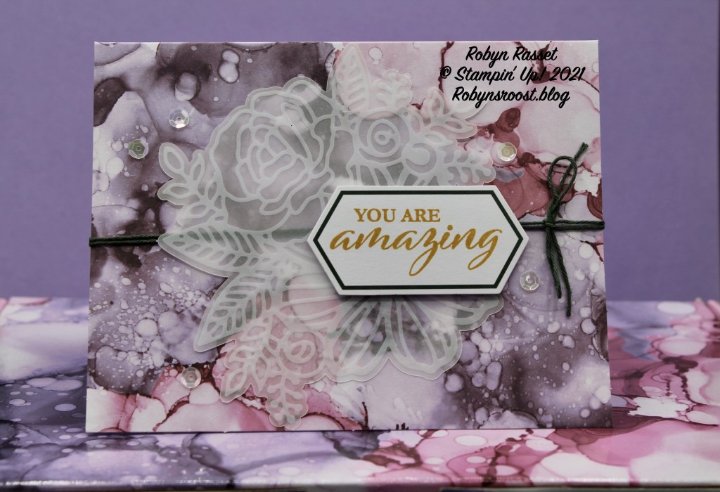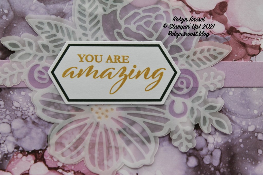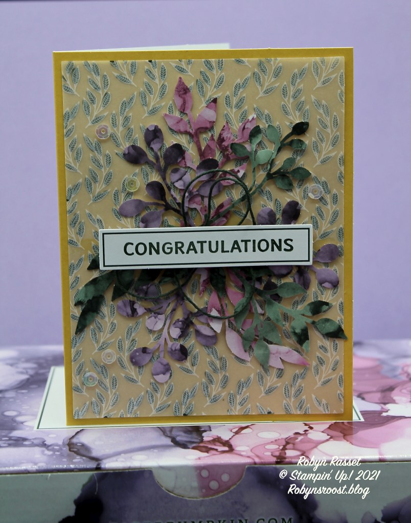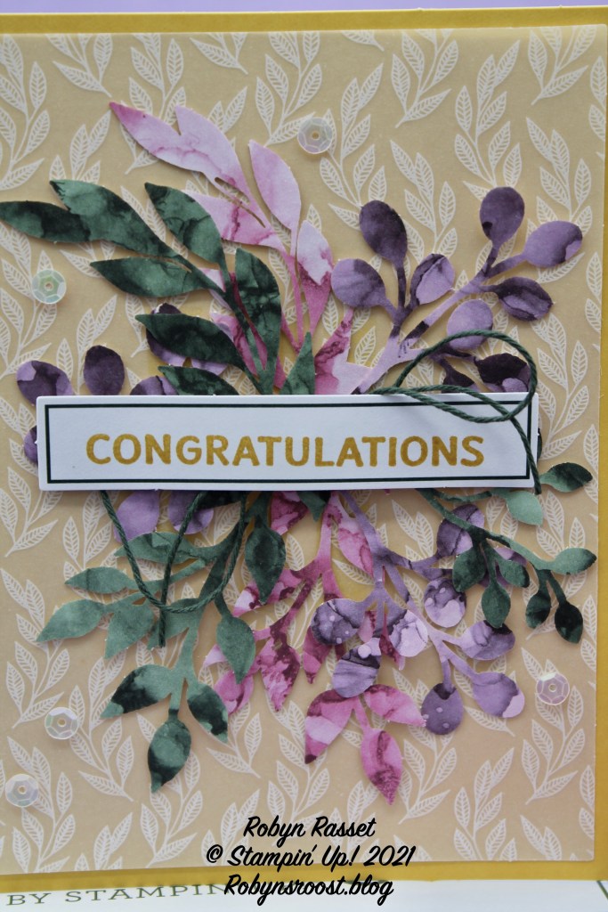 For the card with my personal twist, I swapped the twine for a strip of Fresh Freesia card stock and colored the back of the vellum piece with Highland Heather and Soft Succulent Stampin’ Blends.