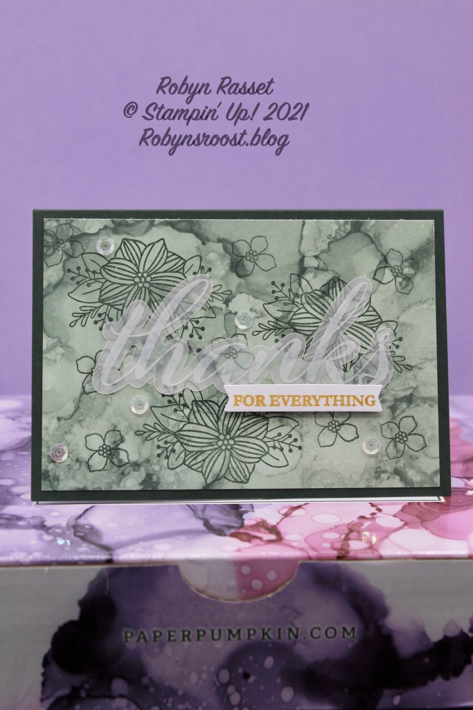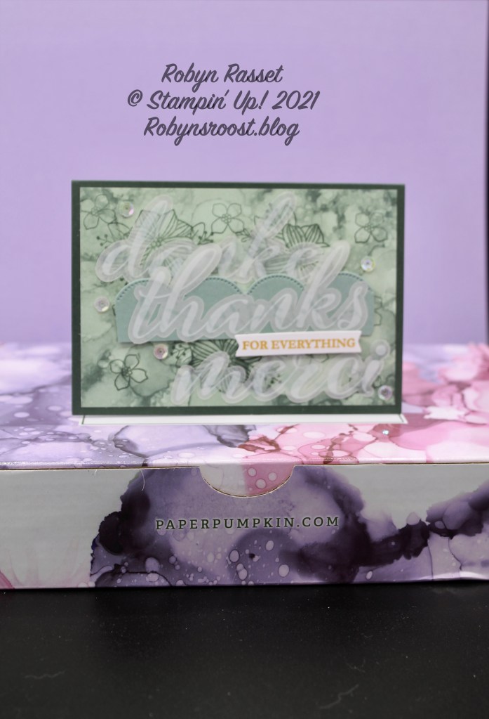 If you watched my Facebook Live on Friday you saw the unboxing of the Expressions in Ink Paper Pumpkin kit. As I unboxed the kit, I didn’t get really excited about it, but as I started putting the cards together it really started to grow on me! The cards are super easy to put together. As I said in the video, I’m really liking the new layout for the instructions. This kit is perfect for someone who wants pretty, handmade cards in minutes. I especially loved that it included two ink spots in great colors (Bumblebee and Evening Evergreen) for flower cards. They are a nice addition to my spot collection. I love using my ink spots when I travel and they are also good for the Stamparatus. The stamp set in this kit is one that I could see being used over and over again. It has nice greetings and the pretty flower and splotchy fill in stamp. I made one of each card exactly to the directions, then created a second card with a twist. Finally, I created a card using just the stamps and a few supplies from my shelf.