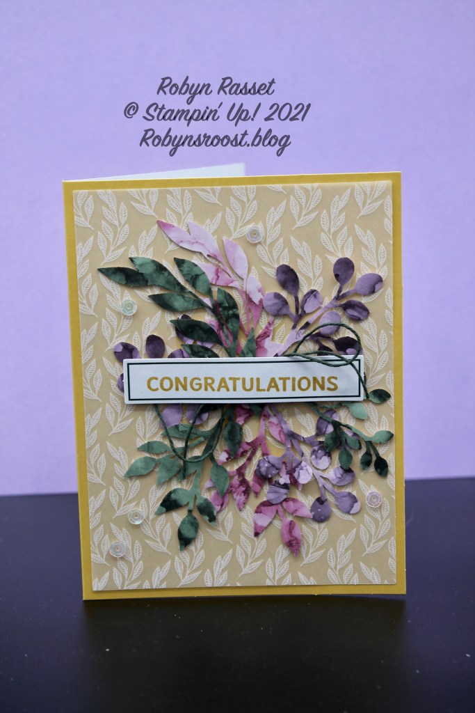 The card base is Fresh Freesia. The Highland Heather layer is 5 1/4″ x 4″. The greeting is stamped with Tuxedo Black and Bumblebee on a 5/8″ x 2 1/4″ piece of Bumblebee. A scattering of Rhinestone Jewels was added, but I think the sequins from the Paper Pumpkin Kit would have been a nicer addition.