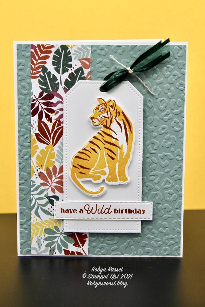 Shelly’s card has a Soft Succulent background that is embossed with the Animal Print Embossing Folder and a 1 1/2″ x 5 3/8″ strip of the In the Wild Designer Paper. The large label is cut with the Tailor Made Tags (AWESOME DIE SET!) and the small label is cut with the Stitched Rectangle Dies. The STAR of the SHOW is stamped with the Wild Cats stamp set and die cut with the coordinating Big Cats Dies. It’s topped off with some Evening Evergreen Ribbon and Linen Thread.