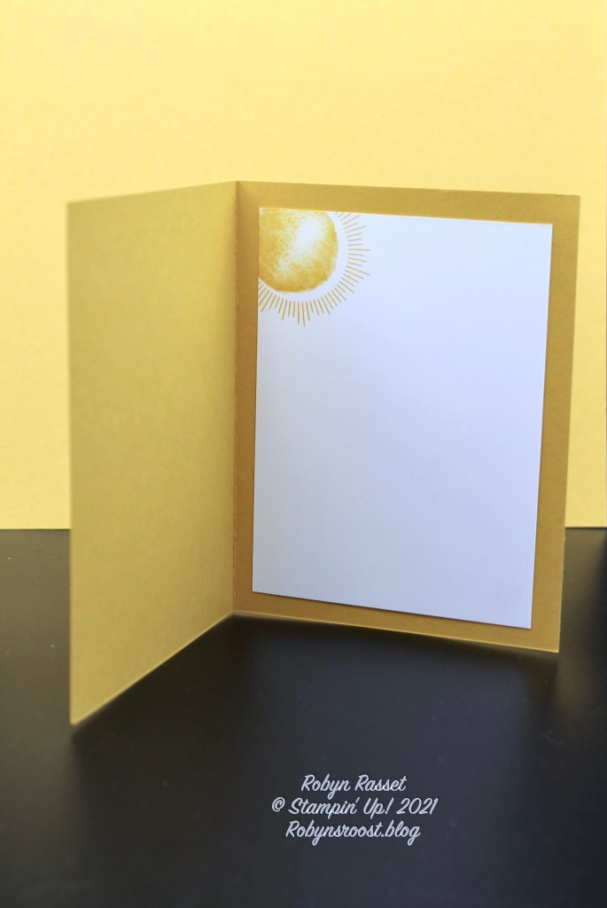 Mary Alice’s birthday card is sure bright and cheery! It features the Sharing Sunshine stamp set. I love the cheeky sun face! The red rhinestones echo the bright cheeks. I also have to share the cute feature that Mary Alice added to the inside of the card.