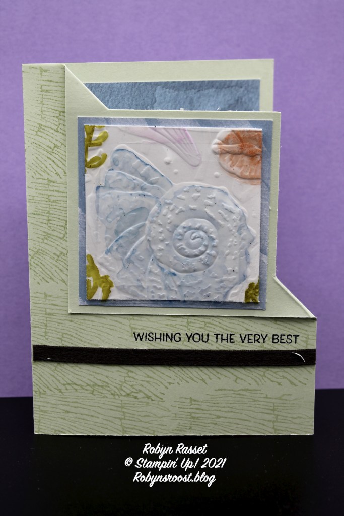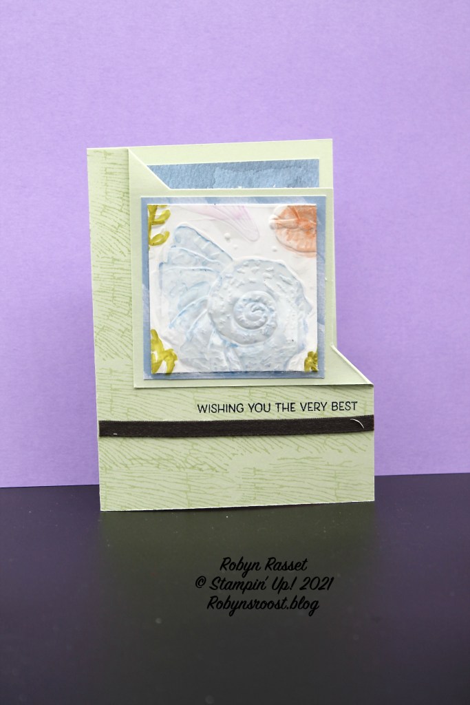 The window sheet and basic white layer are 2 1/2″ squares and are embossed with the Sea Shell embossing folder. The window sheet is colored with Stampin’ Blends on the back side and adhered to the basic white layer with Stampin’ Seal + around the edges. My original plan was to create a frame to layer over the window sheet to hide the adhesive but I thought it looked okay, so didn’t add the frame. There is a 2 3/4″ square Matt of the retired Sand & Sea designer paper behind it, as well as on the inside of the card.
