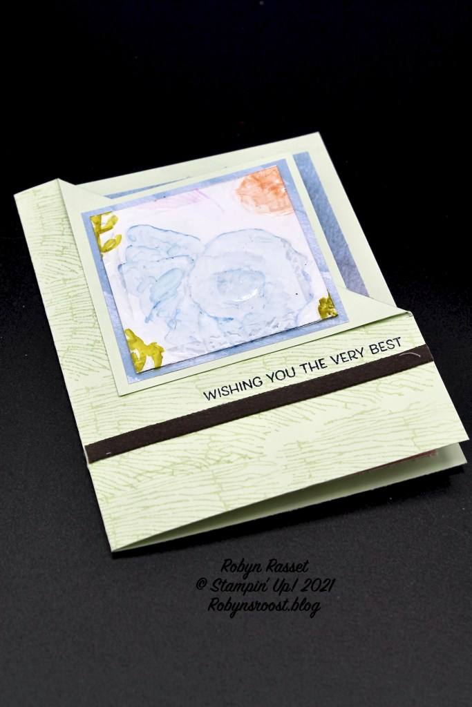 The Early Espresso Suede Ribbon was cut to 4 1/4″ and adhered with the Stampin’ Seal +. If you want direction for the Corner Flip Technique I have not one but TWO videos explaining it. The Prince Charming Corner Flip Card video was done for a Splitcoast Stampers tutorial and the Pansy Petals Corner Flip Card video was an early version.