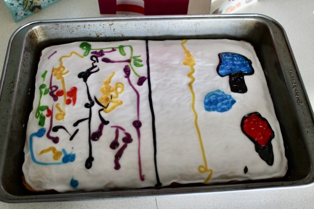 Two of the boys decorated the cake and couldn’t decide what to put on it, so their mom drew a line across the cake and they each decorated a side. The right side is a ping pong table and the left is a pool complete with a diving board. I love the mix of colors and how excited they were about decorating the cake for me.