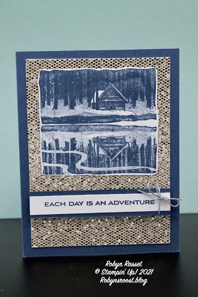 I’m a nature nut! I love trees and cabins in the Northwoods. When I saw that the new July to December Mini Catalog had not one, but two cabin stamp sets, I knew that I had to get both of them. The Reflected in Nature stamp set has a large image stamp with the reflection already done for you. Yay! No stamping the image onto a block and stamping the block onto the paper, just stamp the whole image all at once.