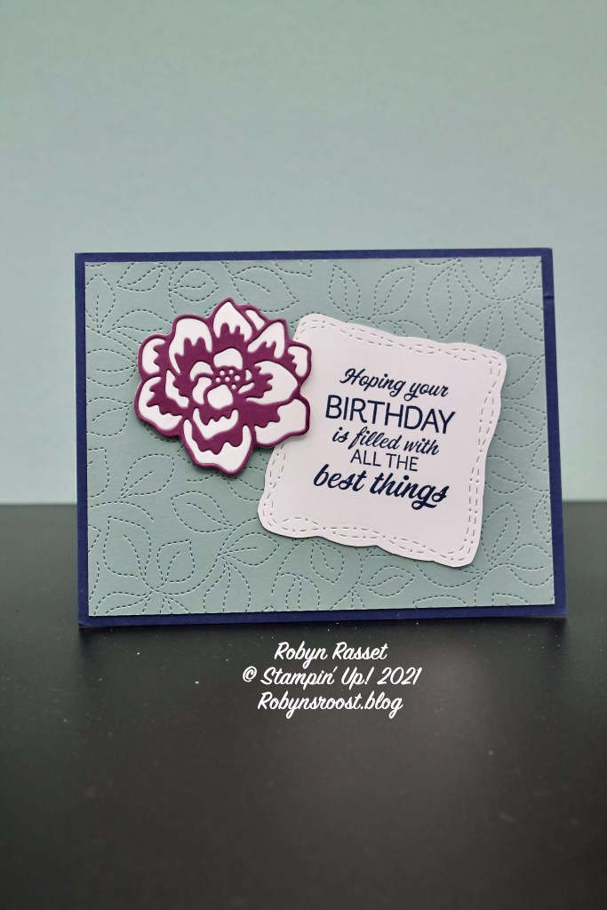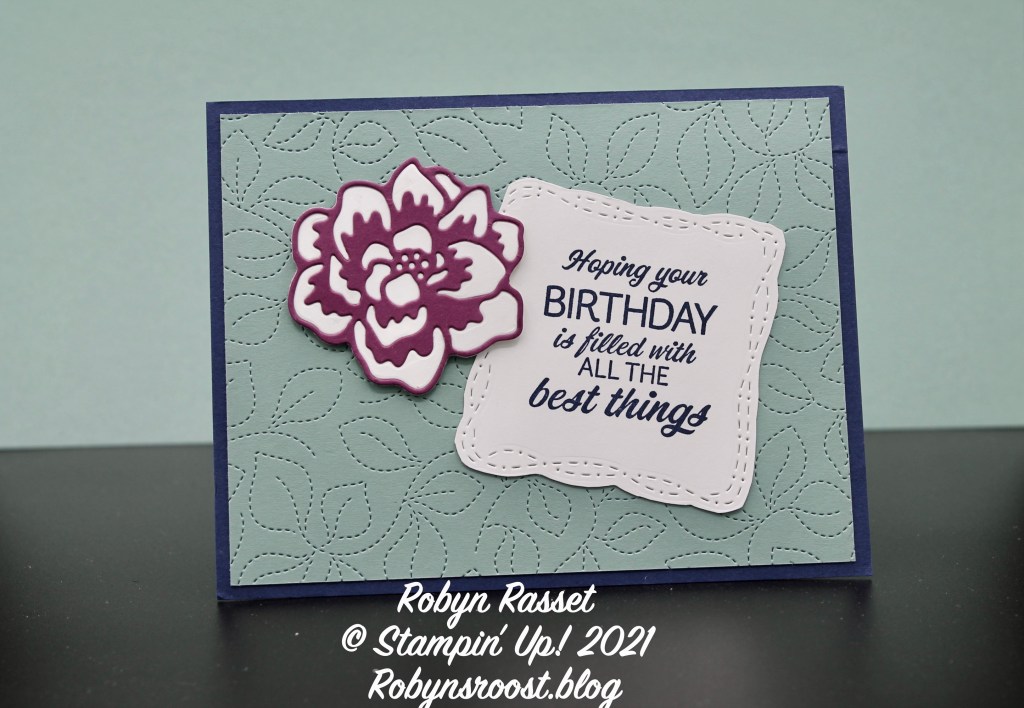 Karen started with a standard 8 1/2″ x 5 1/2″ piece of Basic White card stock scored at 4 1/4″ for the base and added a 4 1/4″ x 5 1/2″ piece of Night of Navy to the front. The next layer is where the magic begins! The pretty stitching on the Soft Succulent layer is created with a large die called the Stitched Greenery Die. It doesn’t cut off any part of the paper, but adds the detailed leaf stitching to the paper. AWESOME! The greeting is stamped on Basic White with Night of Navy ink and then die cut with one of the Stitched With Whimsy Dies, again these dies don’t cut out any pieces of the paper but add a decorative stitching. It was then trimmed around the stitching to create a label. The final die cut piece is the flower, which was created with the Iconic Die set. I’m not quite sure how Karen cut the background, white layer, of the flower which the outlined flower sits on, because the die set only contains the outlined die not a background. If I hear from Karen about how she did that, I’ll update this post.