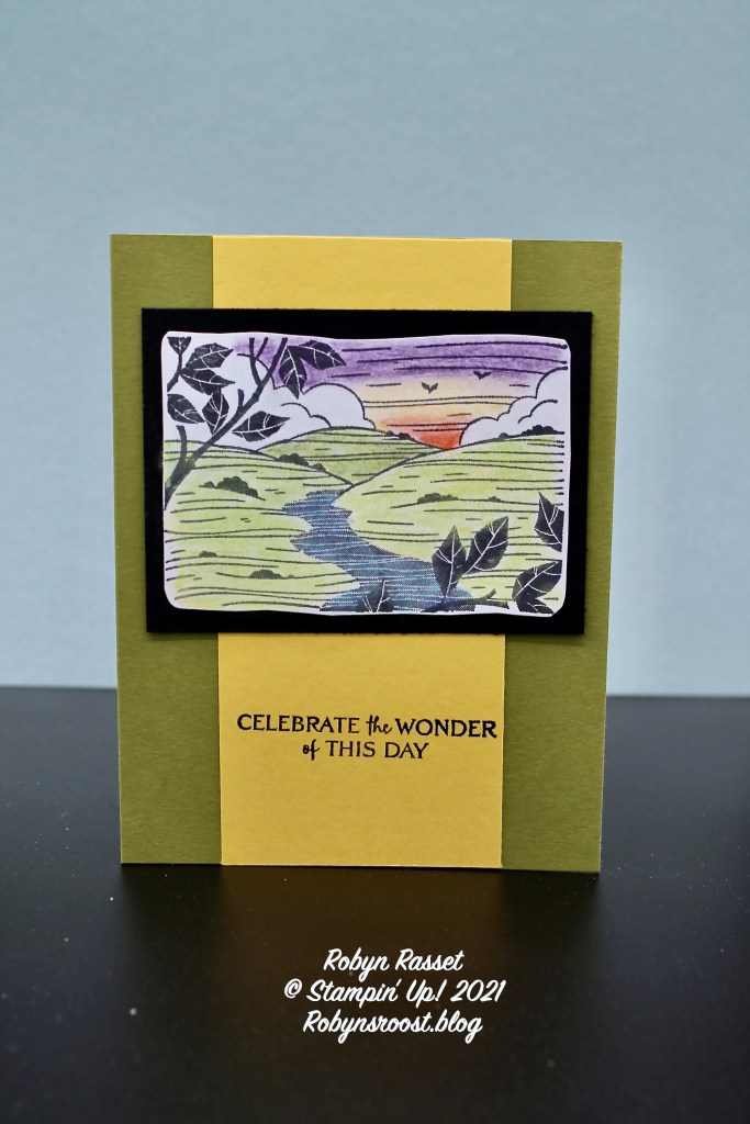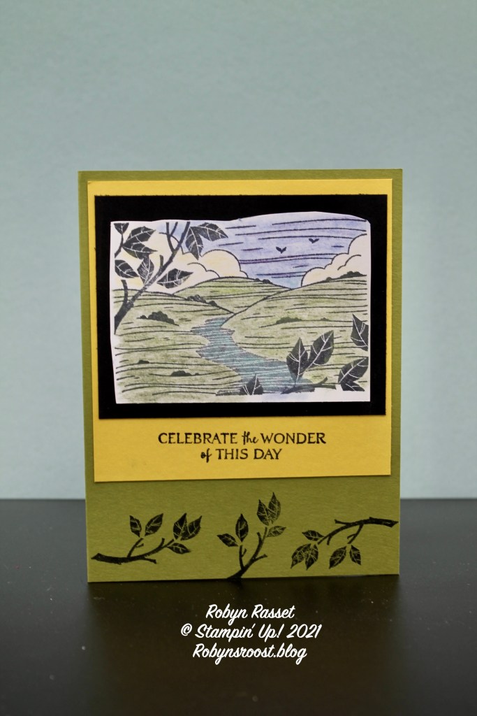 I did find that I was wishing there was a white color in the set, I think it would give a whole additional option of colors to blend. Here is my second version of the card using a bit different coloring scheme. The darker green was used on the grass and no red and yellow on the sky.