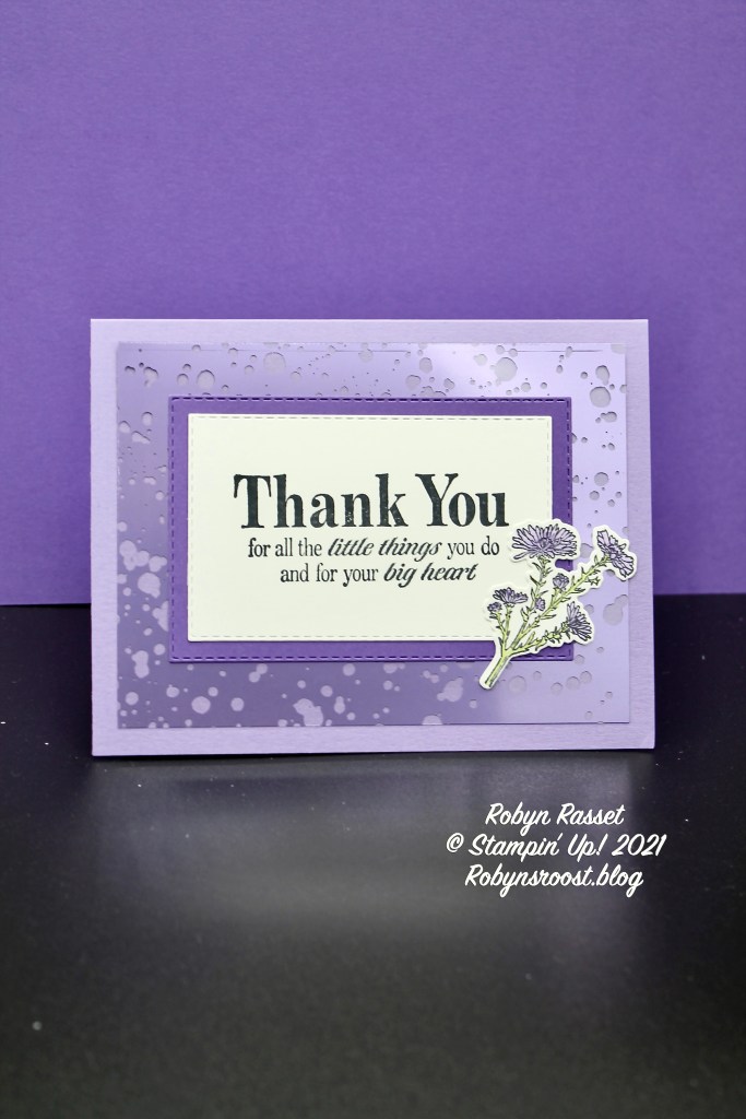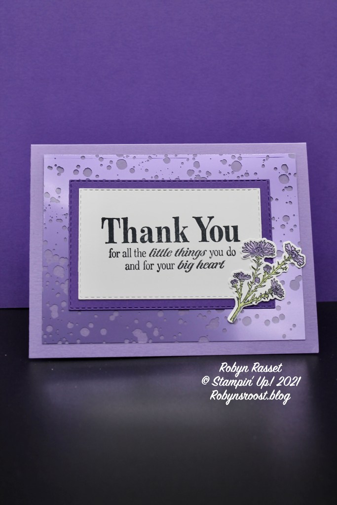 The little flower sprig is from the Nature’s Harvest stamp set (July to December Mini Catalog which is available to order starting August 3) and is colored with Highland Heather and Granny Apple Stampin’ Blend Markers. It is die cut with the matching Harvest Die set.
