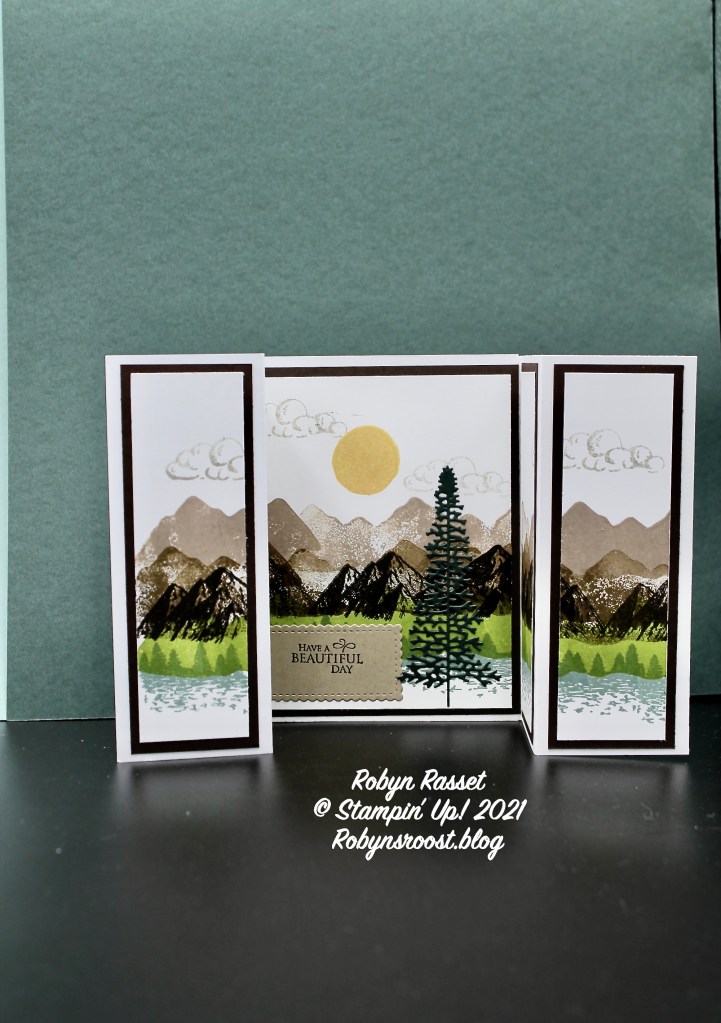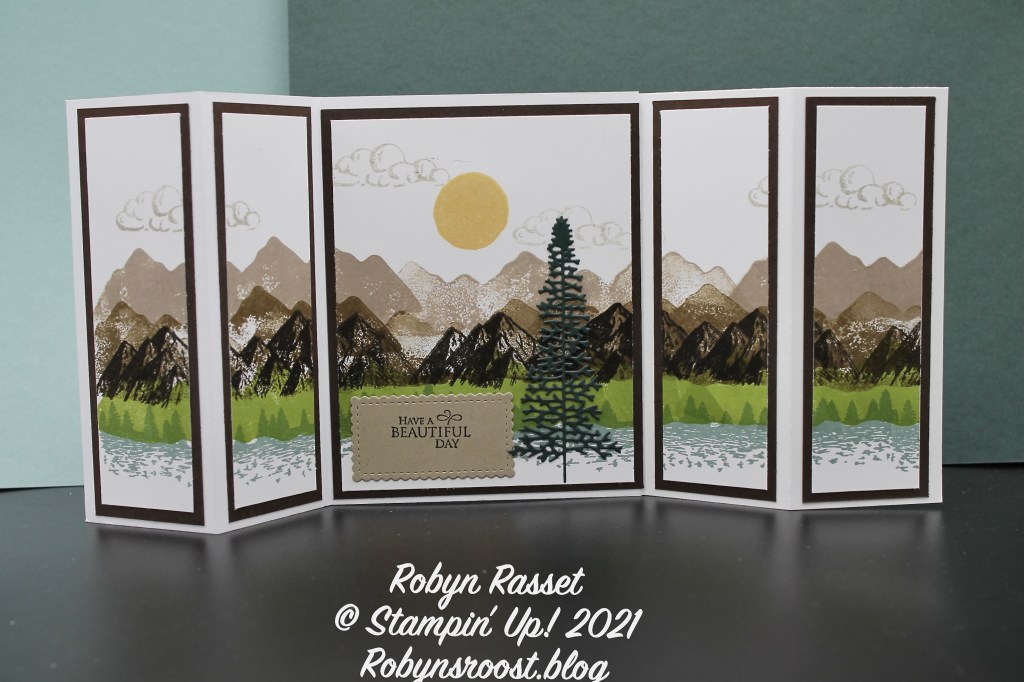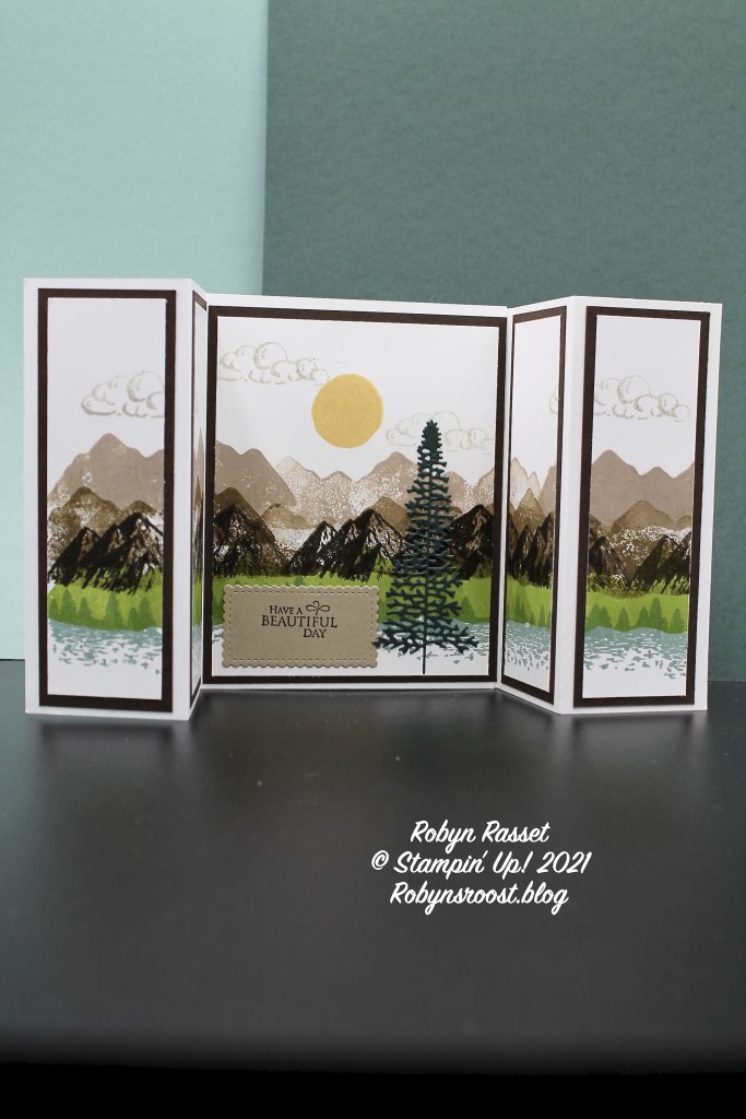 The mountain scene was created on a 10″ x 5″ piece of basic white, stamping the images as follows.