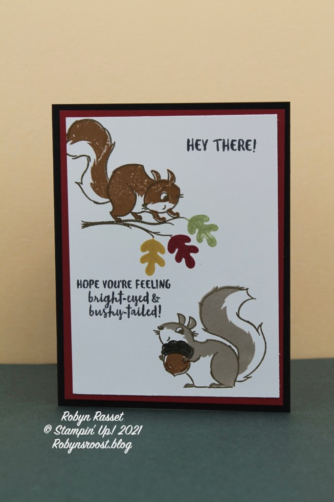 The Nuts About Squirrels set can be found in the new July – December Mini Catalog. It is a two-step style stamp set with both outline and fill in stamps for quick and easy color. No need to color in these fun guys! I would suggest practicing lining up the two images, remembering that their ears have a bit of white left on them.