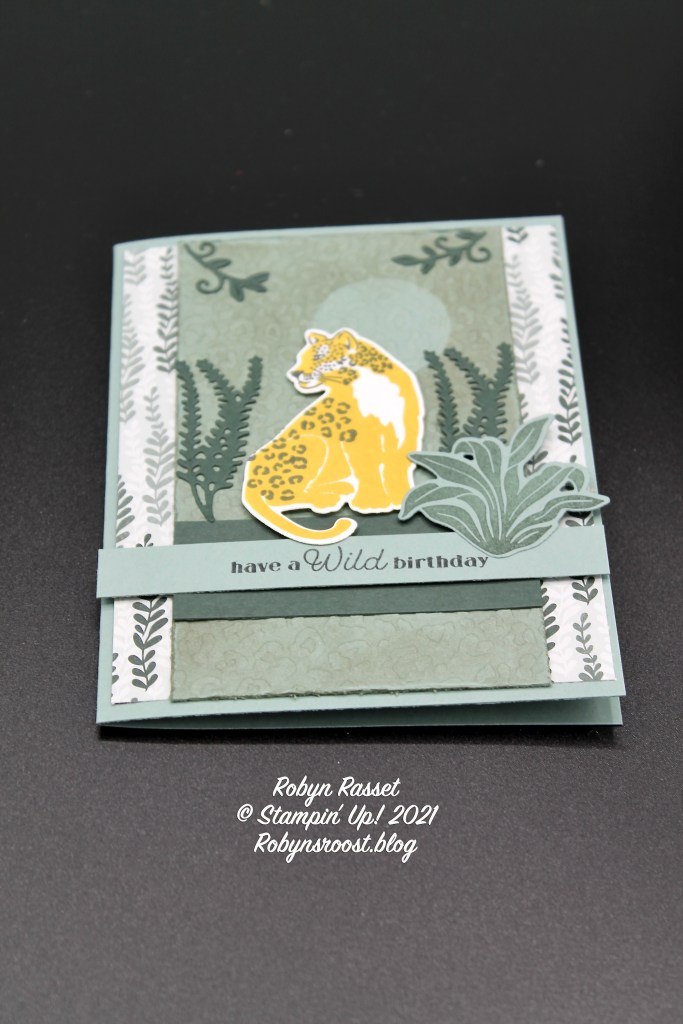 The Leopard is stamped with Crushed Curry ink and the spots are then stamped with Tuxedo Black. He is sitting on a 1″ x 3″ strip of Evening Evergreen. The greeting is stamped onto a 1/2″ x 4 1/4″ strip of Soft Succulent with Evening Evergreen ink. The jungle greenery is die cut with the Big Cat Dies.