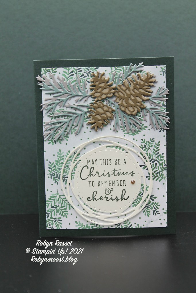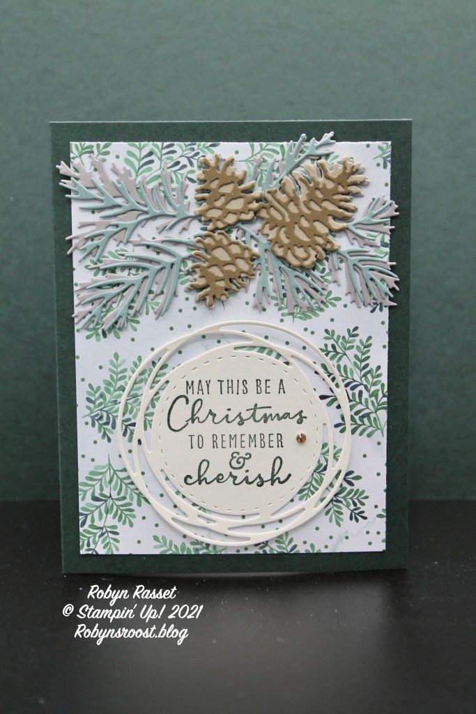 The beautiful pine bough has 4 die cut layers starting with a Sahara Sand shadow, Soft Succulent needles, Crumb Cake pine cone and ending with a Soft Suede outline on the pine cones. All are cut using the Christmas Pine Cone Dies.