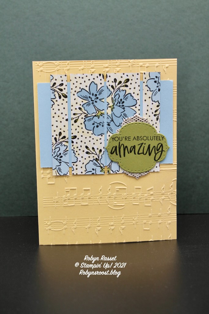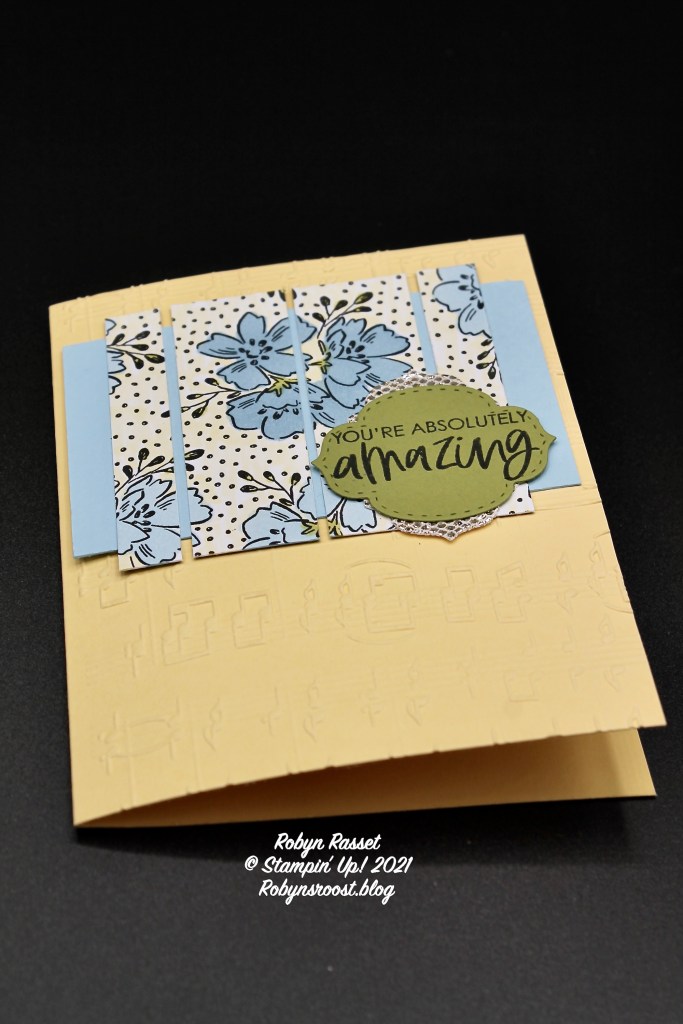 After the Beautifully Penned Designer Paper was colored it was sliced up, oh my! The first cut was 1/2″, the next 1″, then another 1″ slice was cut leaving another 1/2″ strip. They were layered over a 2 1/2″ x 4″ piece of Balmy Blue echoing the flower color.