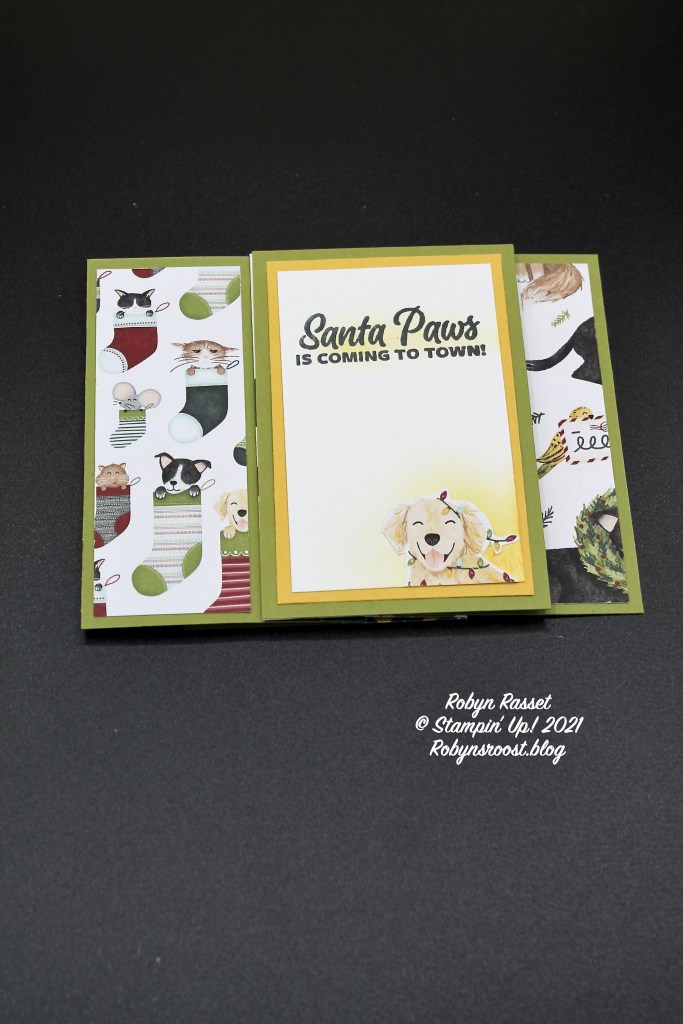 Stamp the greetings to leave a bit of space for a signature. The additional designer series paper pieces should be adhered to the other panels to compete the card.
