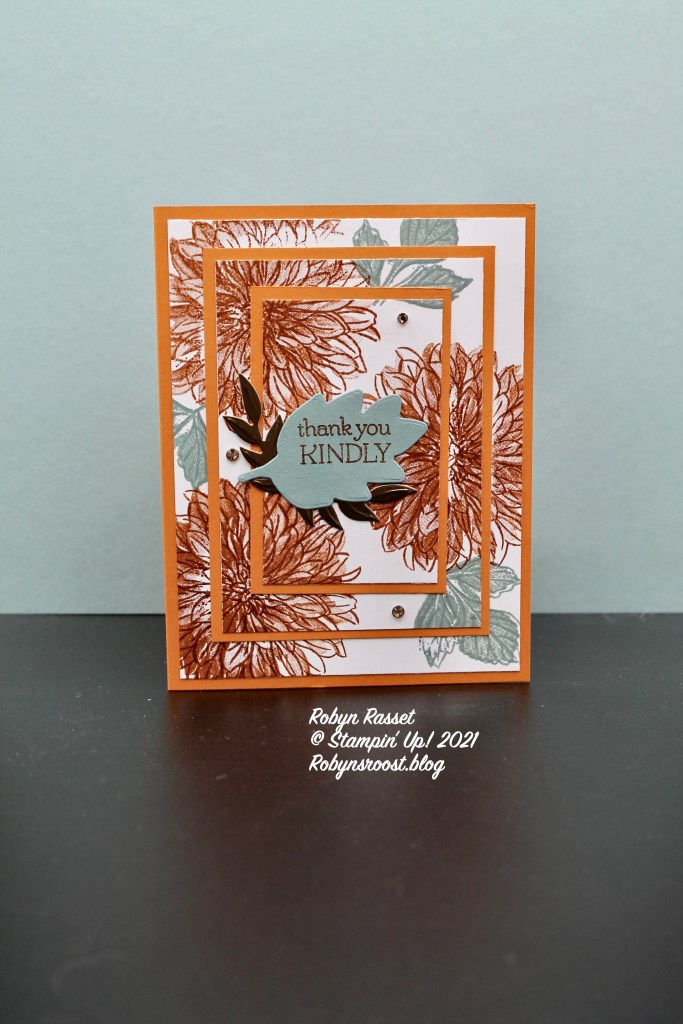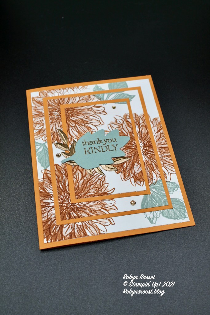 The greeting is also from the Delicate Dahlia stamp set. To set it off, after stamping it was die cut with a die from the Forever Flourishing Die set. Another sprig of leaves was die cut from the Forever Flourishing Die set from Brushed Metallic paper and layered behind the greeting. To finish off the card a sprinkling of Champagne Rhinestones was added.