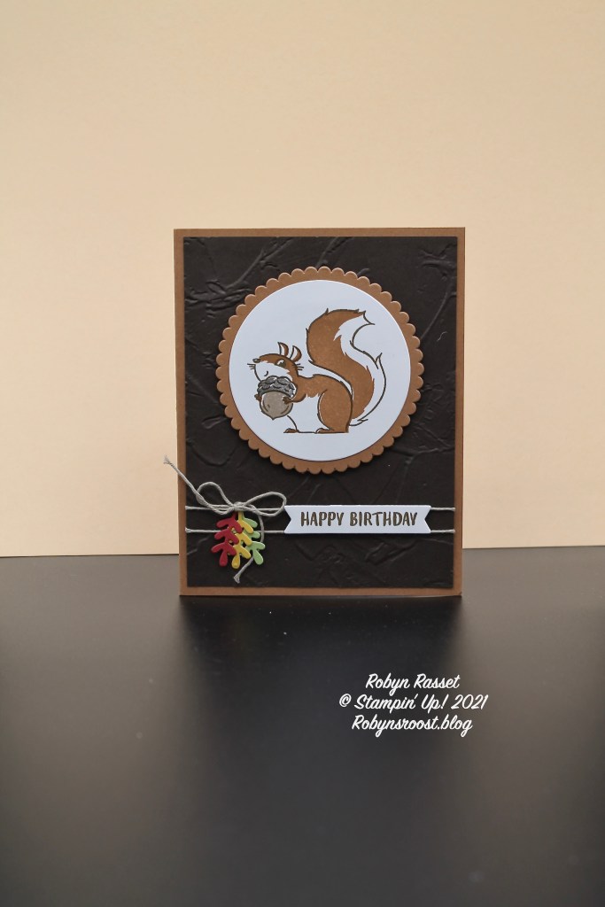 This card made by my good friend and fellow Hollywood Stamping Chicks team member. The Nuts About Squirrels stamp set is perfect to get in the fall spirit! The set has two fun squirrels in the two-step style, so no need to color, just a simple stamp to fill in the colors. The squirrel on this card is popped up and some circles created with the Layering Circles Dies (which are a must have for serious card makers). The Early Espresso background is embossed with the Painted Textures 3D embossing folder. I love the way that Sandy placed the greeting label on the Linen Thread to make it look like a banner and the bright leaves add just the right touch of color.