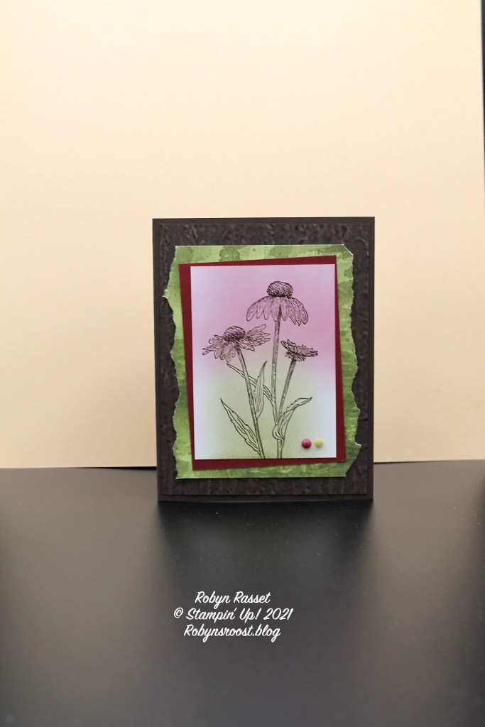 Bev’s card also has a fall feel to it with the textured Bark 3D embossed layer and the torn You’re A Peach Designer Paper. The flowers are from my current favorite stamp set, Nature’s Harvest. I love the way that Bev has added color to the flowers with Blending Brushes. If you aren’t a fan of coloring, Blending Brushes are AWESOME!!