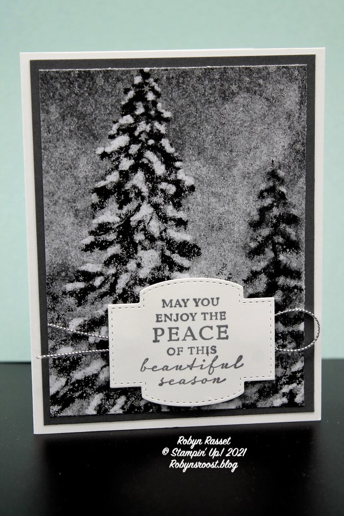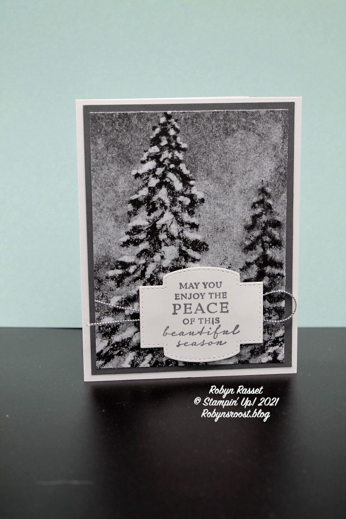 This super easy to make card features the Peaceful Place Designer Series Paper. You can get 6 cards out of one sheet and there are 2 sheets with this design in the pack. The greeting is part of the Peaceful Cabin stamp set which is in the Peaceful Place Suite. Rather than tying the silver trim around the card layer, instead it is simply looped under the greeting. The trim is from the Simply Elegant Suite and comes in a 2 pack with both gold and silver. The label die cut is found in the Stitched So Sweetly Die set, one of my favorites! It has both a set of cute label dies and a set of scalloped, stitched rectangles too.
