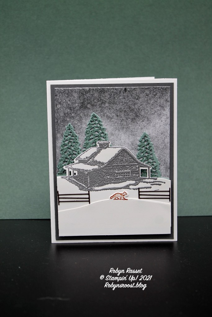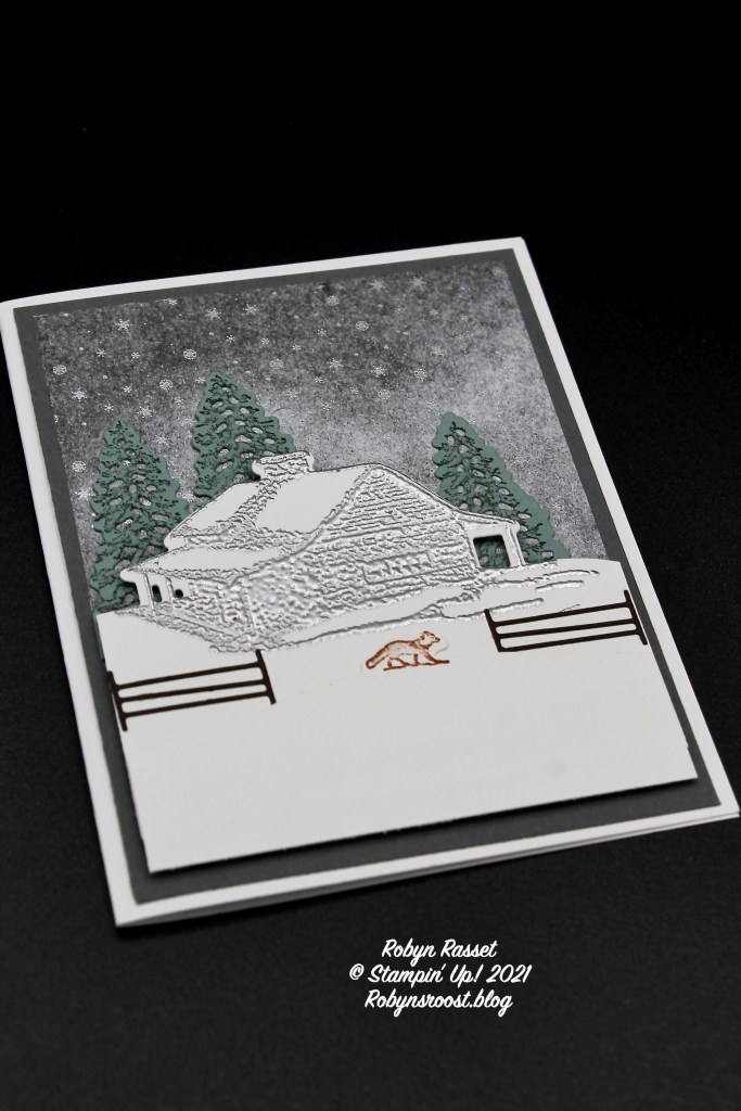 This little fox is so cute crossing this cabin yard in the silent snow! I left off the greeting so that I could use this for a birthday card or just a note, or of course a Christmas card. The cabin was embossed with Silver Embossing Powder and die cut using the Cabin Die set. The trees were also stamped and then die cut. The fence doesn’t require any stamping, and was simply die cut from Early Espresso cardstock. I love the Peaceful Place Designer Series Paper that was used on the background! It made a perfect starry night scene for my fox. By the way, the fox was stamped with Cajun Craze ink, perfect for a red fox.